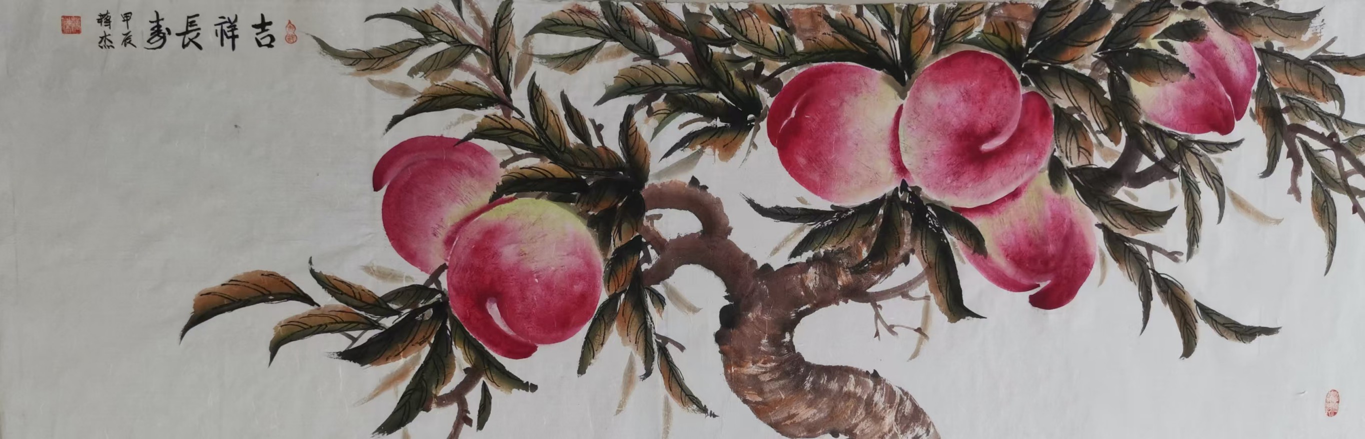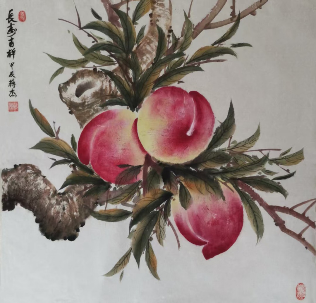 蒋杰先生自幼痴迷中国传统文化,信奉道法自然,知行合一。先后师从李淑华和贾进考两位老师,甚得二老喜爱,并获悉心指导。其专攻寿桃创作,潜心钻研,形成了独特的艺术风格。细赏其画作,笔法娴熟、构图巧妙,整幅作品即得古风,又赋新意。那颗颗桃子粉嫩娇艳、令人垂涎欲滴。其画作端庄秀丽,尽显福寿祥瑞之气,多于写实和写意之间营造出朴实清新之韵味,备受书画收藏者推崇。