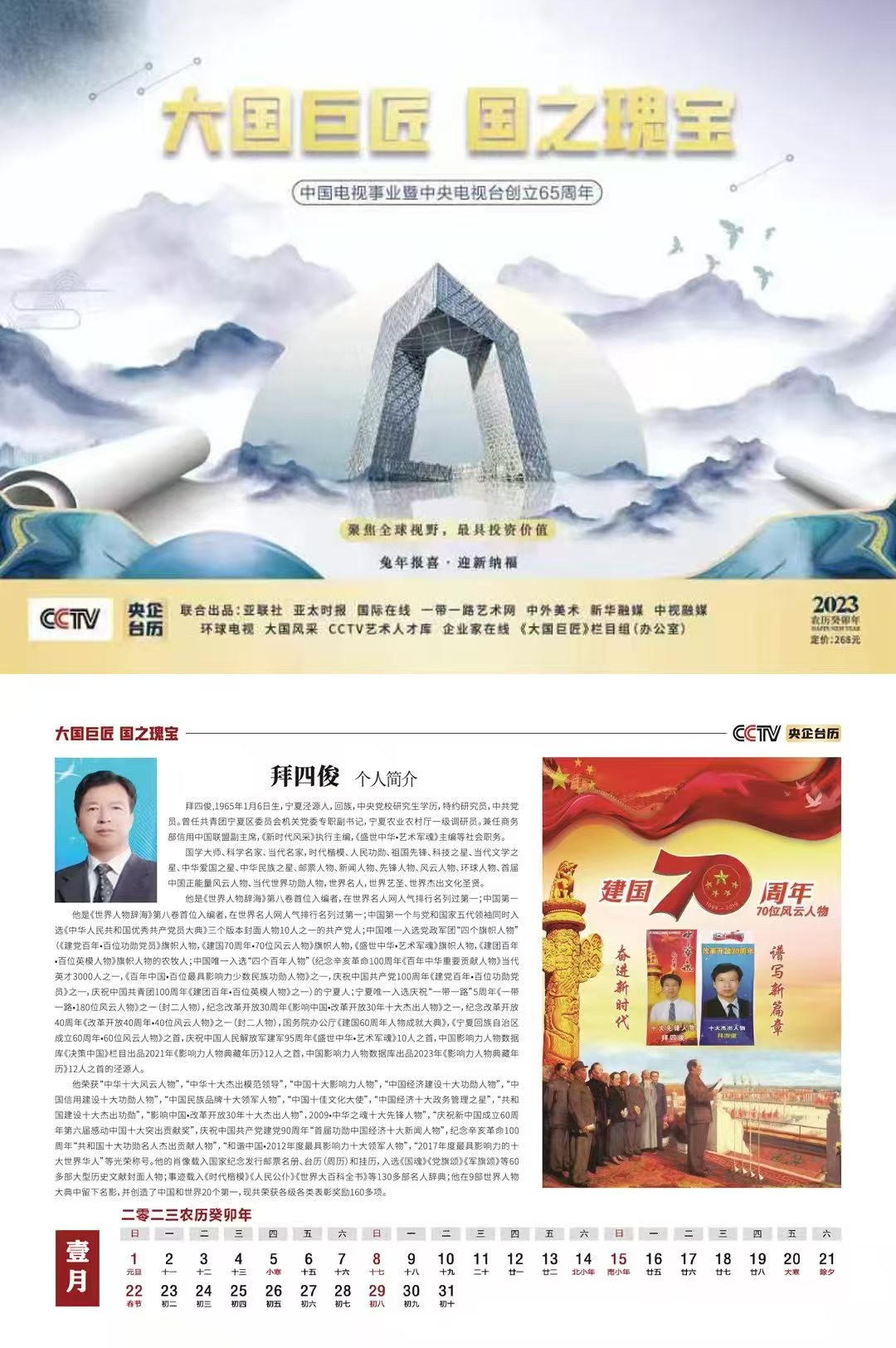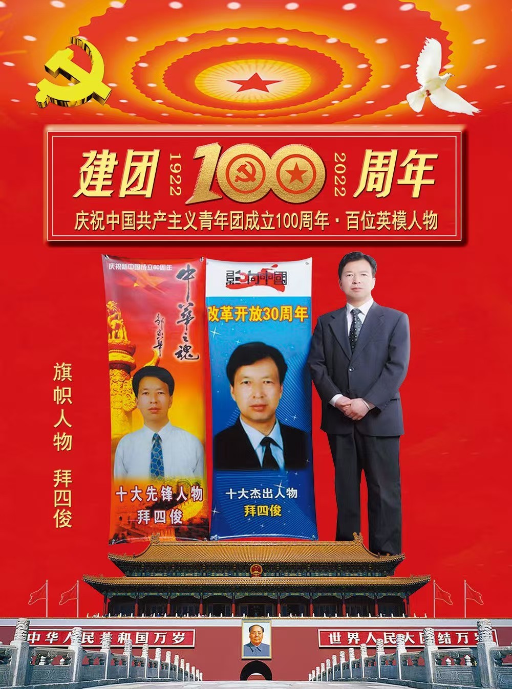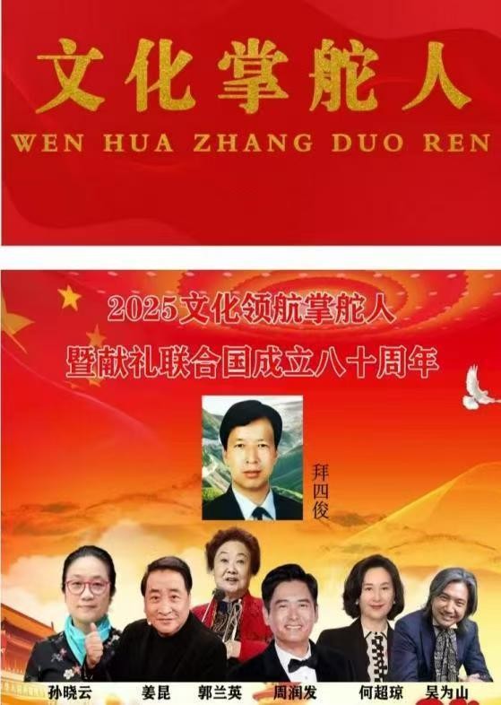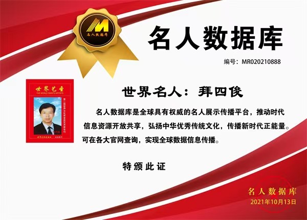 2024年,入选决策中国栏目联合中国影响力人物数据库编撰出版“中国梦,百年潮——2024行业影响力人物”典藏挂历12人之一;入编中国评纶出版社《时代骄子》,入编纪念伟大领袖毛泽东主席诞辰130周年,中国科学文化出版社《大国榜样》专刊、光大出版社《鲜红的旗帜》《鲜红的旗帜•共和国前进路上的擎旗手——拜四俊》专刊。