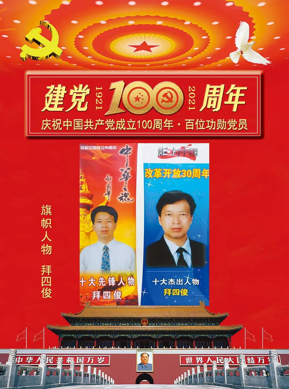 2013年,在纪念毛主席诞辰120周年活动中,他的肖像载入“中国梦”纪念毛泽东诞辰120周年个性化邮票名册,并给他颁发了“国家建设优秀人物”荣誉奖牌;他的传略载入由中国毛泽东思想学术研究会编著的大型文献《中华英才缅怀领袖毛泽东》中;并在本卷书征文大赛中,《时代功勋中流砥柱》——首届功勋中国经济十大新闻人物拜四俊一文,被中国毛泽东思想学术研究会评为“特等奖”;被商务部研究院、财政部财政科学研究所授予“中国信用建设十大功勋人物”光荣称号;被中国国际经济技术合作促进会、中国商业企业联合会、中央机关老干部文化交流中心授予“中国经济建设十大功勋人物”光荣称号;他的传略载入大型国际交流文献《世界人物辞海》第八卷首位。