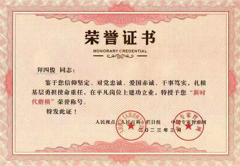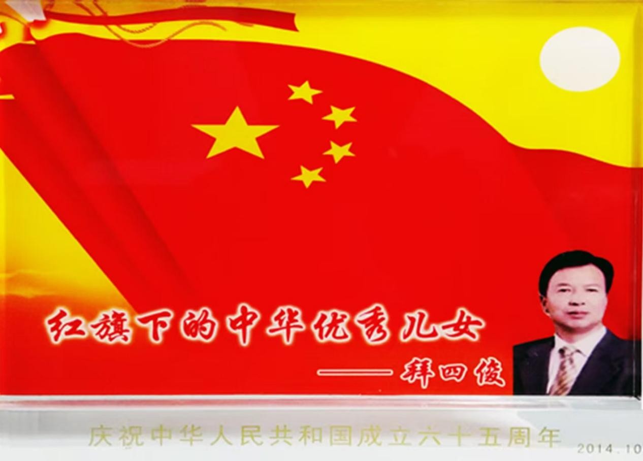 在由毛泽东思想学术研究会编写,中国文化传媒出版社《中华魂•当代人民功勋》中,他被评为“共和国建设十大杰出功勋”(档案号:zhhL2015-9776)。并以不问回报勤奉献 赤胆忠心为人民——记共和国建设十大杰出功勋拜四俊为题,对他进行了宣传报道。