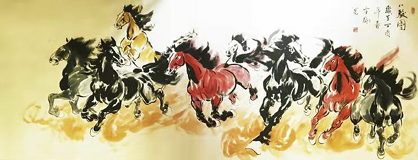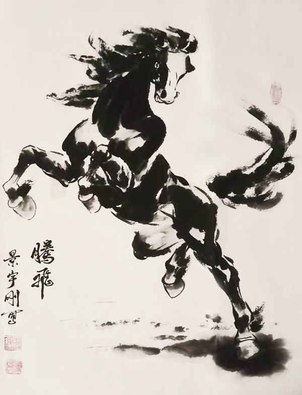 骏马历来是文人墨客歌颂的主题,在中国画坛上,马的形象、精神和神韵,占有突出的地位。景先生属龙,自诩常有龙马精神,而其又爱画马,画出的马尤其突出马的龙性。先生在二十多年的绘画研习生涯中,靠着自己的艰辛磨练,和对艺术的不懈追求,与画马结下不解之缘,并在中国国画界终有所成。先生笔下的马,神形兼备,写意马以草书入笔,勾勒顿挫间,无不透露出其深厚的笔墨功底。他的画马作品,有龙的精神,马的神韵,结构严谨,神形兼备 ,笔墨到位,夸张之处又不失法度,是当今画马界不可多得的奇才。”他的三分钟画马方法用简单到位却苍劲有力的笔墨勾勒出或卧或立、或动或静的马,让人拍手叫绝。