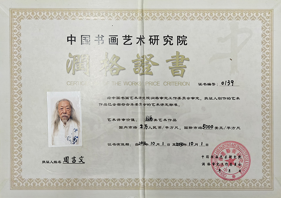 2010年,10月,经中国书画艺术研究院润格审定工作委员会审定,周吉文作品,已全部符合艺术评定标准,艺术评审价值:国画类艺术品,国内市场2万人民币/平方尺,国际市场5000美元/平方尺。