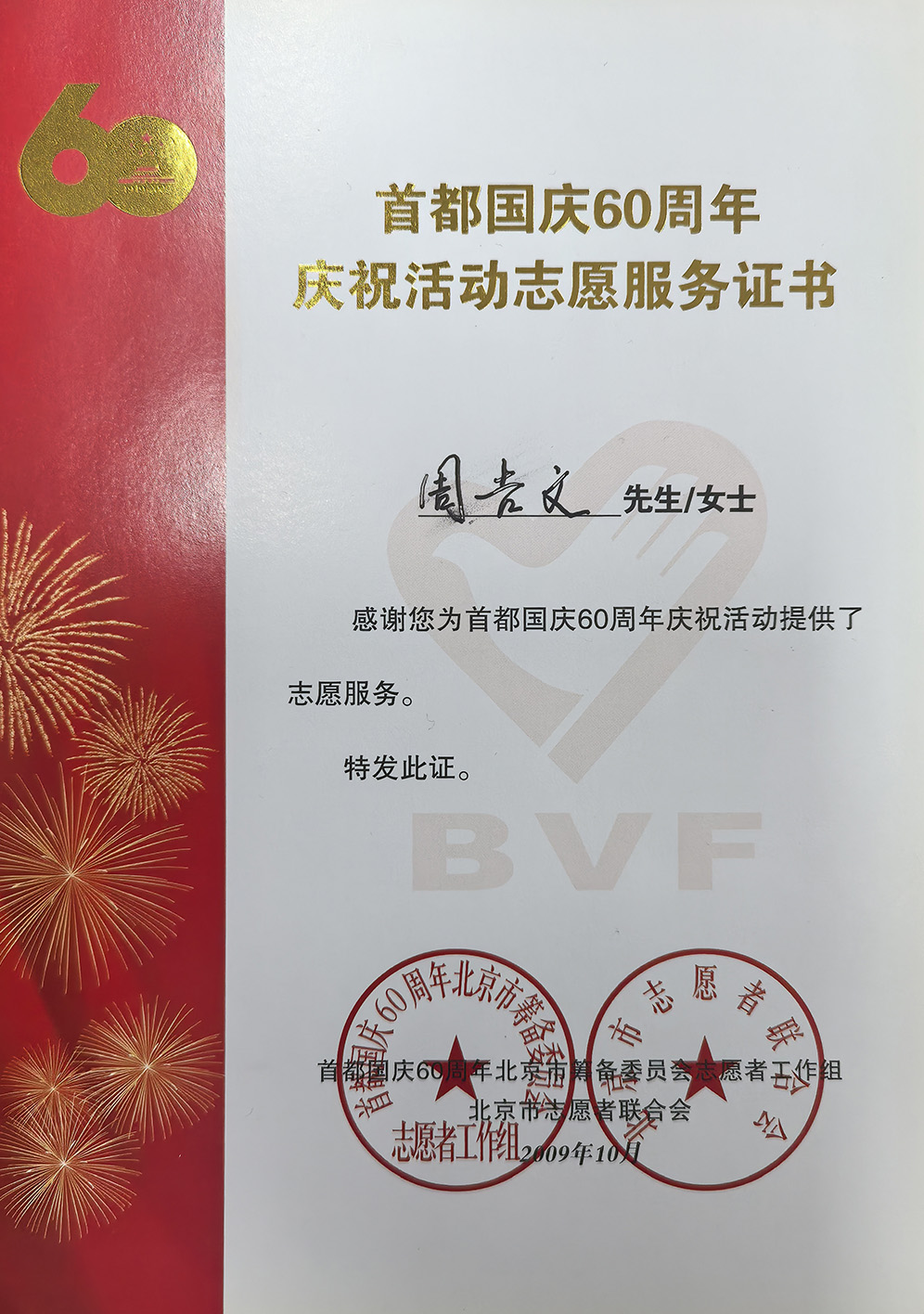 60周年北京筹备委员会志愿者工作组颁发“首都国庆60周年庆祝活动 志 愿 服 务 证 书 ”