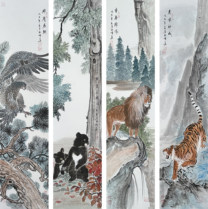 苑承峰 虎雄兽鹰图(四条屏)