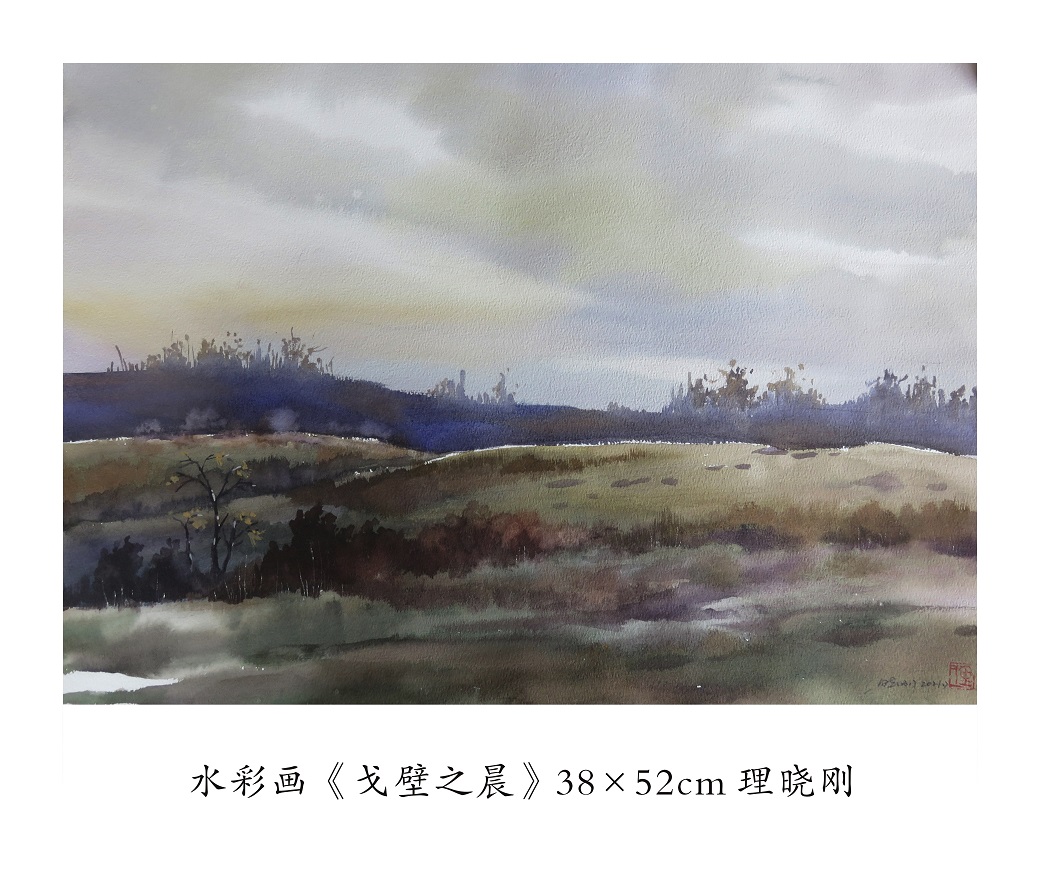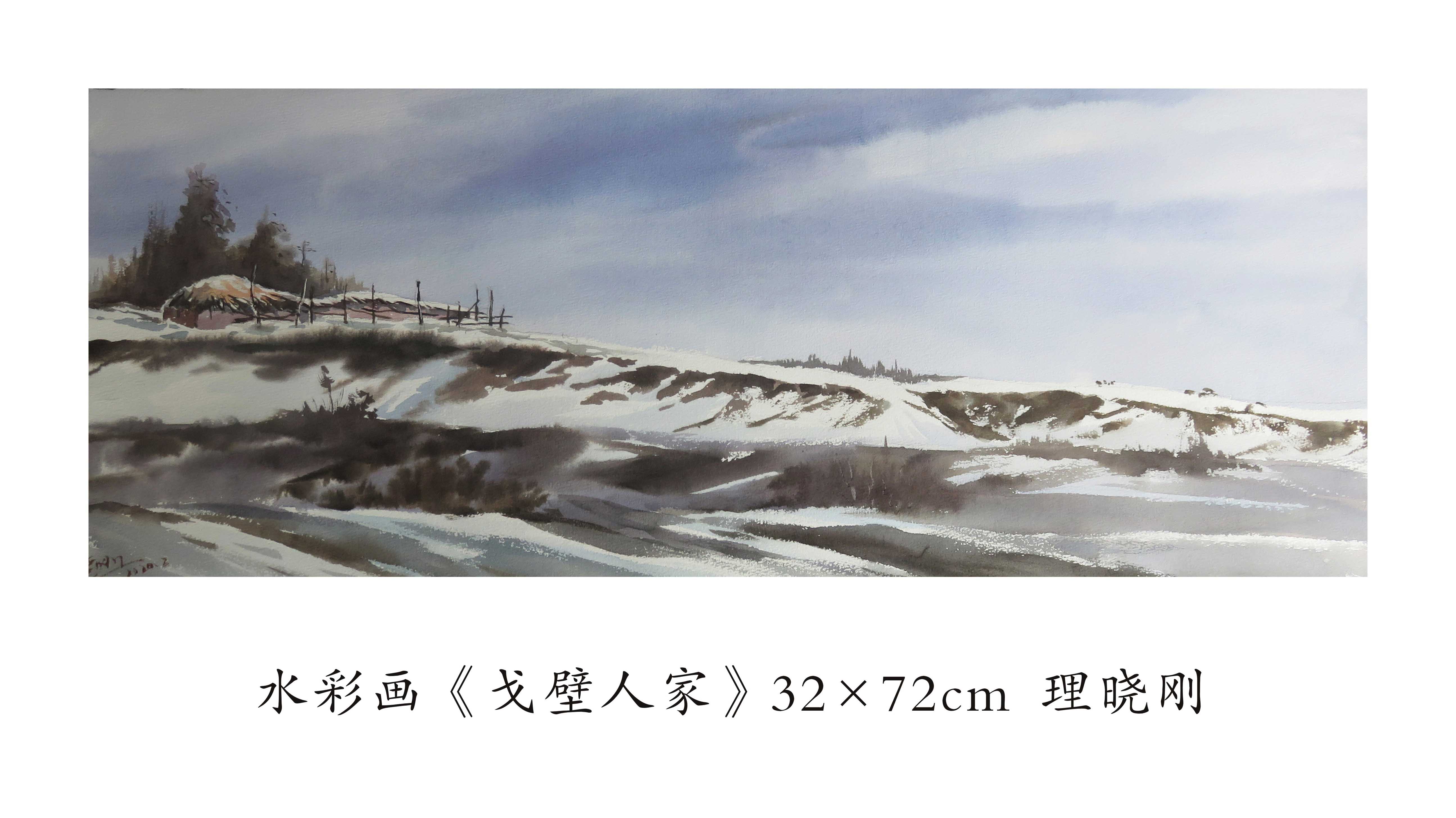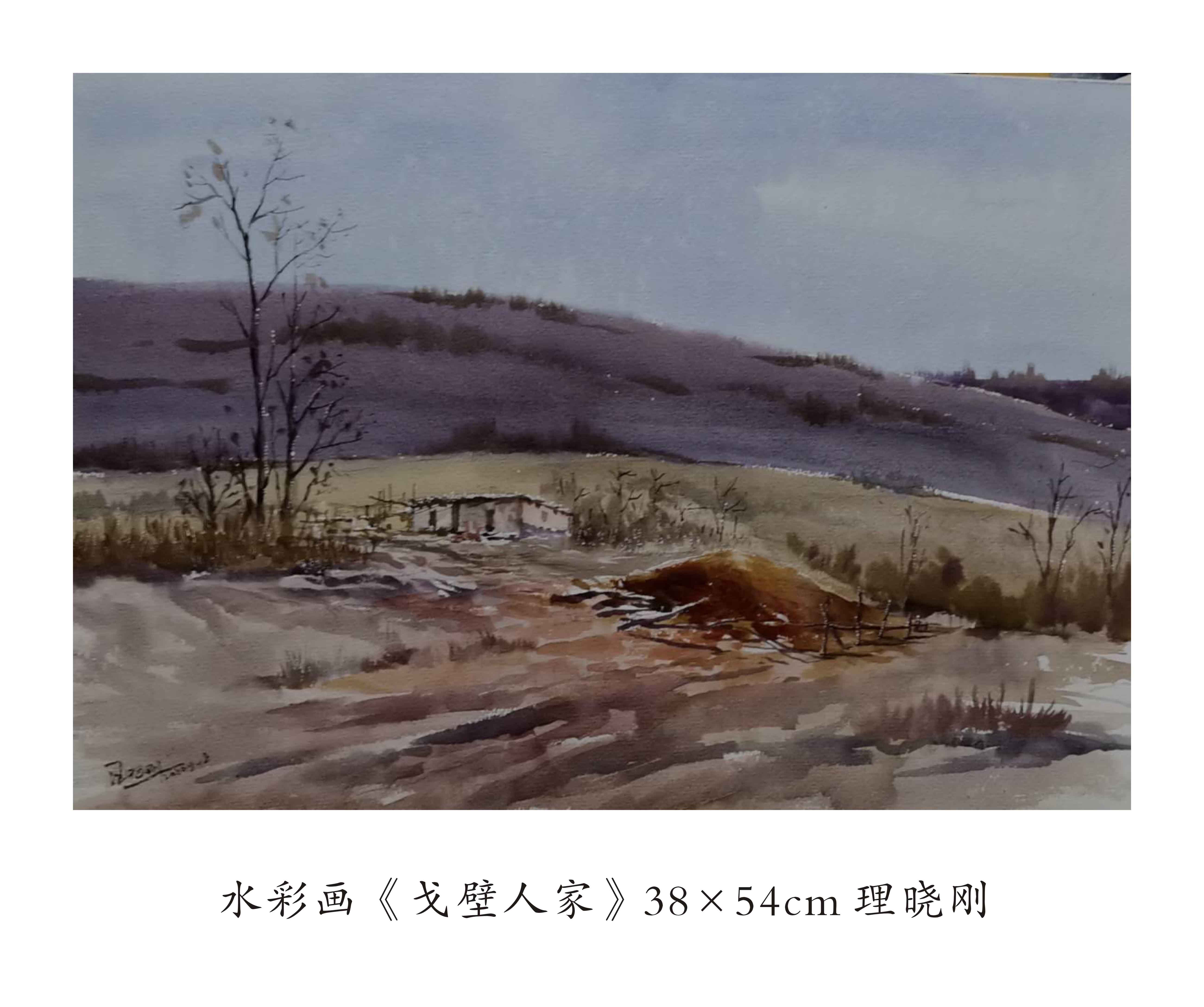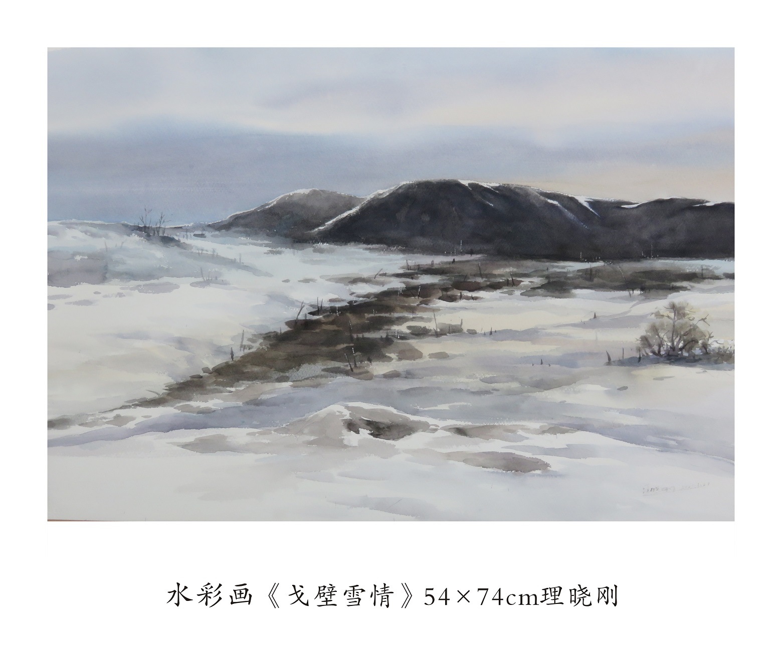 作者理晓刚是兵团的第二代人,经历了六十年代到目前的2020年,可以说:风风雨雨、坎坎坷坷,这些经历与绘画一但联系起来,他的水彩画艺术就不难理解了,比如他的《黄昏.白哈巴》、《戈壁雪情》等水彩画表达了画家非常安静、神密的一种情怀,作者常用这种黄昏下的光色变化来表达这种西北大自然的顺间美感,这与画家的性格特征也非常吻合,在他的作品里基本没有阳光下的热闹场景及蓝天白云下的激情画面等等,