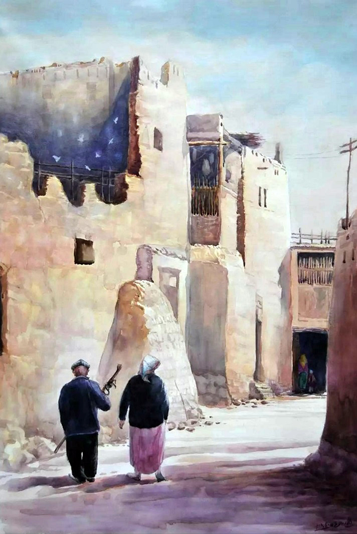 作为新疆人的他经常深入南北疆通过写生体验生活,特别是阿克苏坷平县库木鲁克村,他的《库木鲁克之春》 、《小歇》等作品就是在深入了与朴实善良的维吾尔族人生活体验而创作的作品,同样其作品《古城斜阳》也是画家在多次深入喀什及吐鲁番土裕沟写生及生活体验而完成的作品,特别是作品《古城斜阳》里两位朴实的老人背影,以及老人前方他们的女儿及小孙子,都是背影形像配以炎热的夏日光影及房屋顶部的并不清晰的一群白鸽,让作品有了生活的深度及留下了很多思考和联想:蓝天、古城土房、鸽子、朴实的老人以及浓烈的斜阳都深刻的表达了画家的深意,通过狭窄的古巷道延伸出的空间表达了作者对这个新疆古城的敬畏感和给人们传递了一种自我感受:一个延续平凡、朴实、勤劳的古镇。