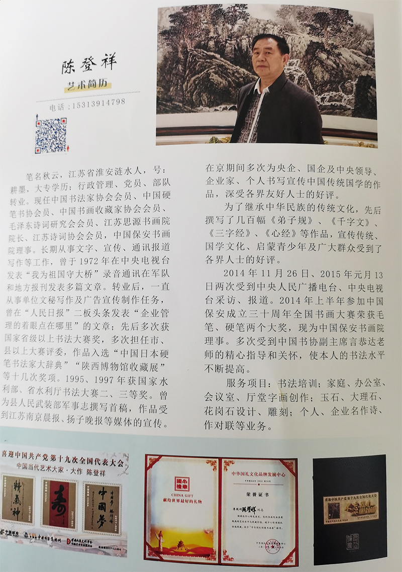 陈登祥,笔名秋云,江苏省淮安涟水人,号:耕墨,大专学历;行政管理、党员、部队转业。现任中国书法家协会会员、中国硬笔书协会员、中国书画收藏家协会会员、毛泽东诗词研究会会员、江苏思源书画院院长、江苏诗词协会会员、中国保安书画院理事、中国广电总局书协会员,央视水墨丹青书画协会会员。