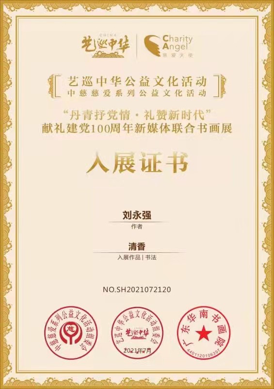刘永强:男,汉族,1969年生,内蒙古自治区赤峰市人,祖籍山东寿光,大专文化,工程师,矿山地质勘查专业,先后在国有金矿、钼矿、锰银矿、银铅锌矿等多地工作学习。现就职于国城集团宇邦矿业。业余书法爱好者,生活工作之余常与笔墨相伴,以古今书法名家为师,崇尚抱朴守拙,自然平和,力求有笔有墨,舒展流畅。多年来临池不辍,一直把中国书法作为文化生活中的唯一追求,部分作品已由多家媒体刊发并获奖,入编了"2021年全国书画艺术"作品集,多部作品被“百年辉煌-百位名家"庆祝建党100周年主题《中国邮册》收录。同时入编翰墨百家艺术人才库。2021墨韵九州“华夏神韵杯"全国书画艺术大赛中获优秀奖;20 21"翰墨中华兰亭杯"全国书画大赛中获优秀奖!2021年翰墨百家"红色庆典杯"全国书画艺术大赛中获得二等奖。现为中国书画家协会会员,中国大众文化学会书画艺术专业委员会委员,翰墨百家书画院书画家。