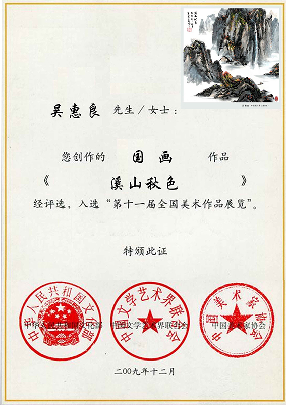 2009年12月吴惠良先生:创作的国画作品《溪山秋色》经评选,入选中华人民共和国文化部,中国文学艺术界联合会,中国美术家协会联合主办“第十一届全国美术作品展览”,入会申报条件合格。