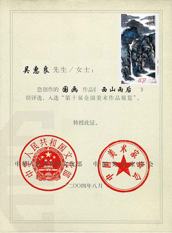2004年8月吴惠良先生:创作的国画作品《西山雨后》经评选,入选中华人民共和国文化部,中国美术家协会主办“第十届全国美术作品展览”,入会申报条件之一。