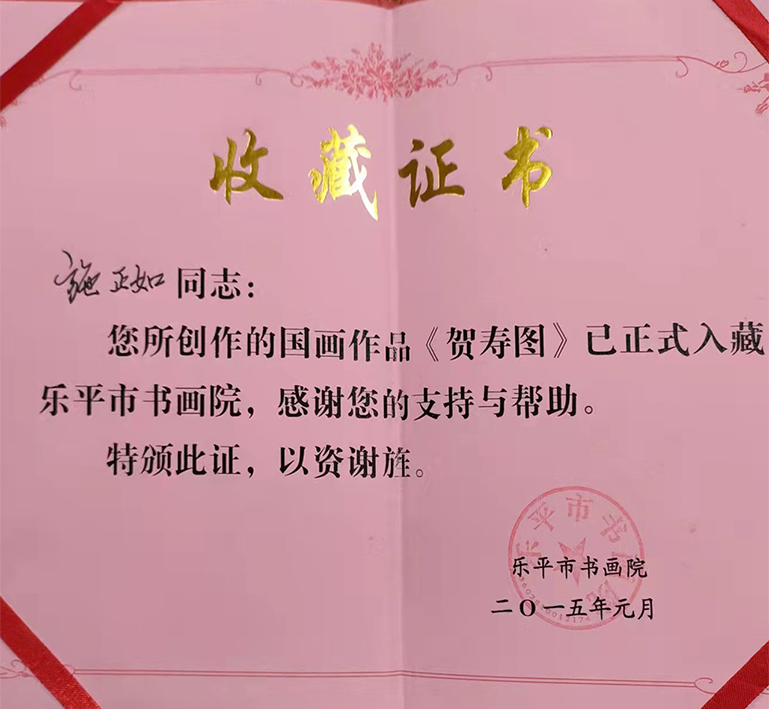 2015年国画作品巜贺寿图》被景德镇乐平市书画院收藏。