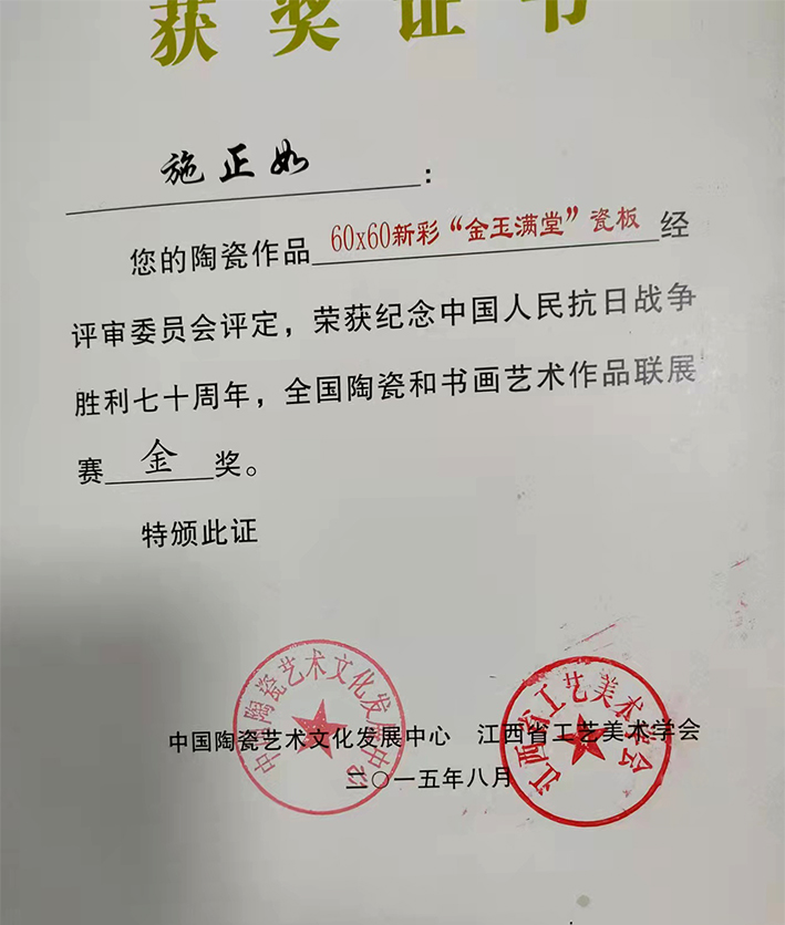 2015年8月陶瓷作品巜金玉满堂》获得江西省艺术文化金奖。