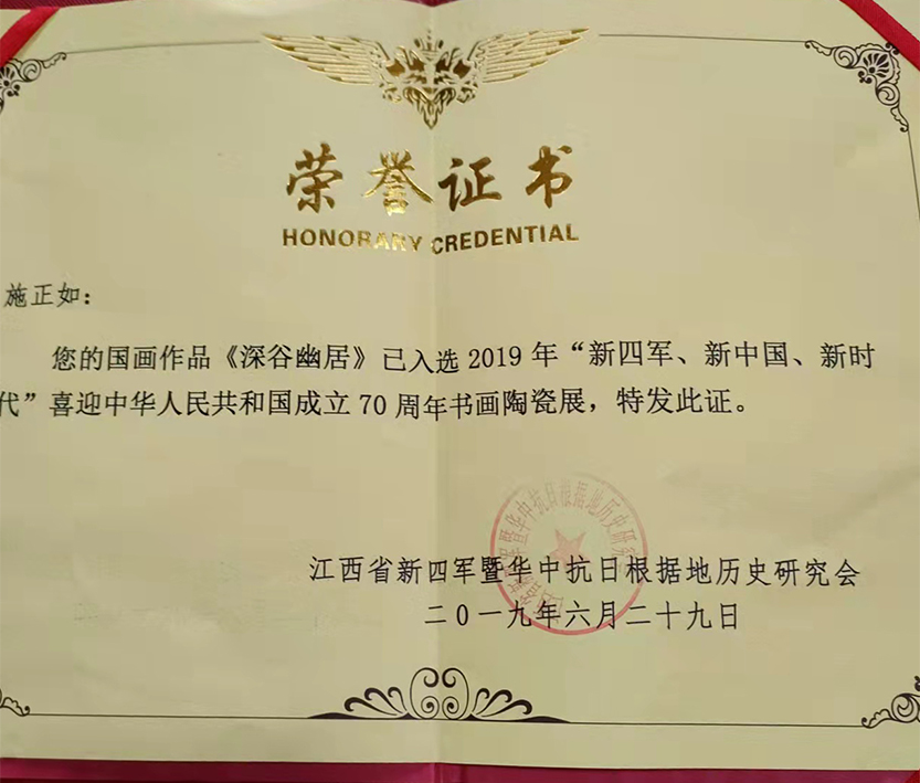 2019年9月陶瓷作品巜深谷幽居》入选"新四军,新中国,新时代″。喜迎中华人民共和国成立70同年陶瓷艺术展荣誉正书。