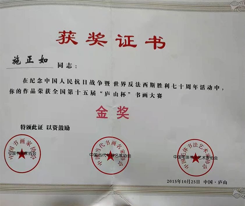2015年10月,在纪念中国人民抗日战争暨世界反法西斯胜利活动中,我的国画作品荣获全国第15庙"庐山杯"书画大赛金奖。