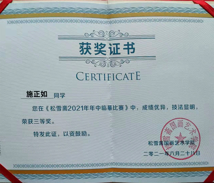 2021年国画作品获得松雪斋国画艺术院三等奖。