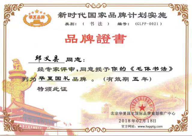 2018年2月,其《毛体书法》被北京华夏国礼国际品牌策划推广中心列为华夏国礼品牌。