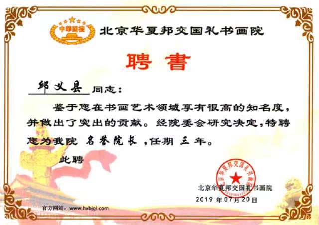 2019年7月被北京华夏邦交国礼书画院晋升为该院名誉院长。