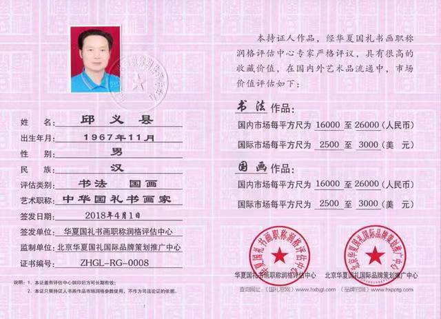 中华国礼书画润格证书编号:ZHGL—RG—0008