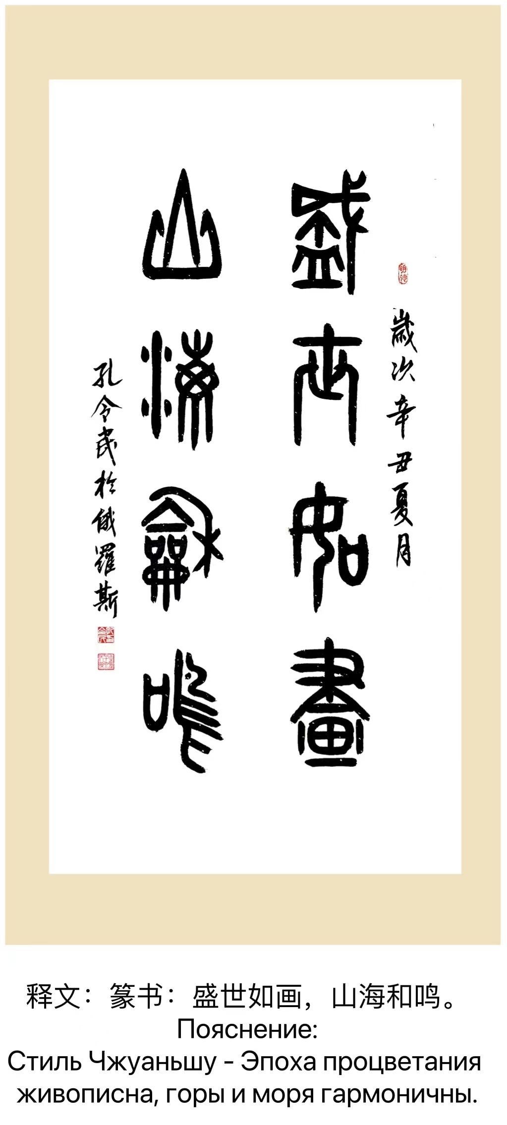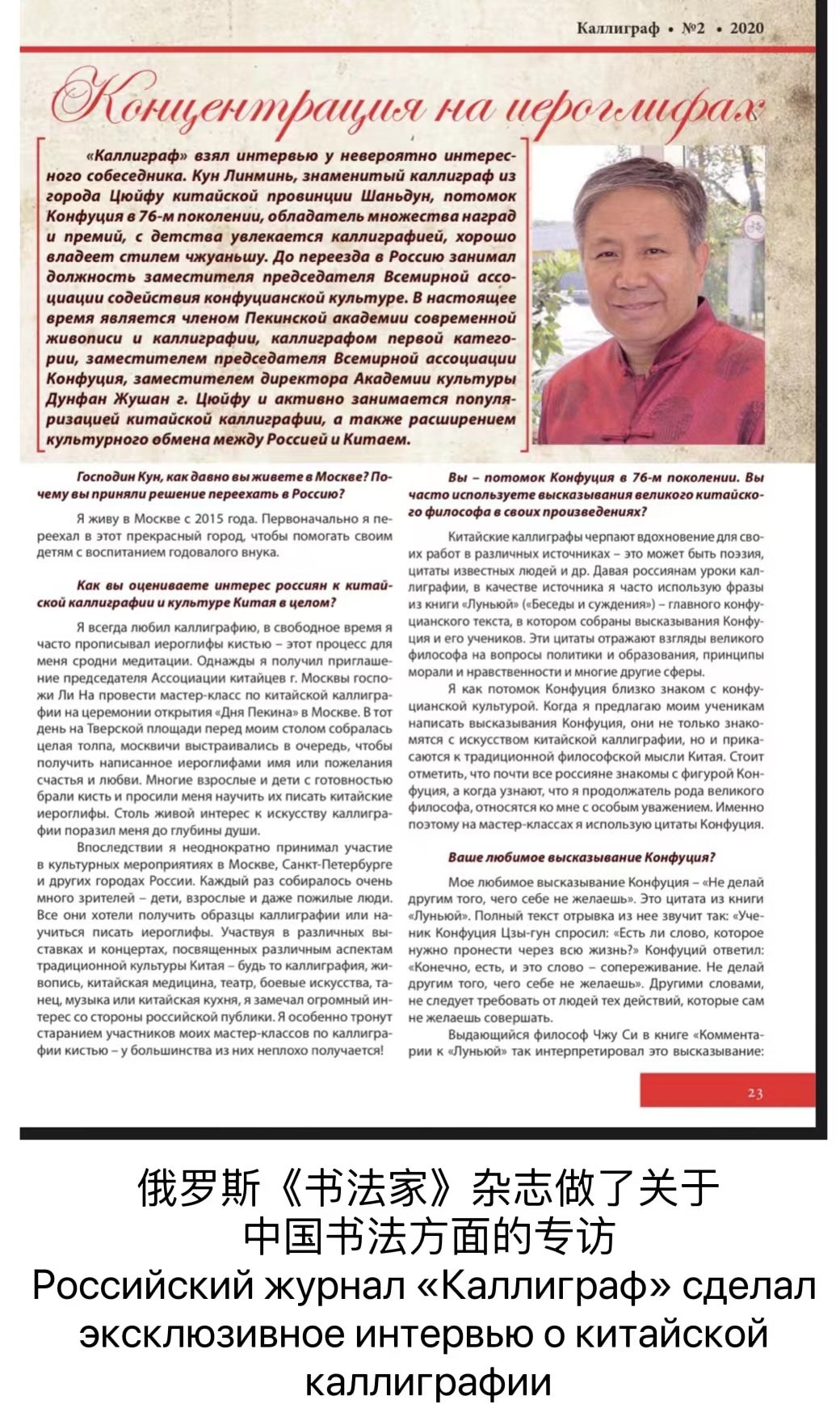 Кун Линминь, уроженец Цюйфу провинции Шаньдун, является прямым потомком Конфуция в 76-м поколении, академиком Пекинской академии современной каллиграфии и живописи, первоклассным каллиграфом. Предпочтение в стилях Чжуаньшу и Лишу, а также и практикуется стили Синшу и Цаошу. Его неоднократно приглашали участвовать в отечественных и международных выставках каллиграфии, многие работы были сохранены в Музее каллиграфии «Русский мир». По его каллиграфическому искусству брали интервью, деятельность мастера освещалось многими СМИ, такими как «Жэньминь жибао», «Первый канал России», «ТВ Госдумы» и «БРИКС ТВ» и тд.