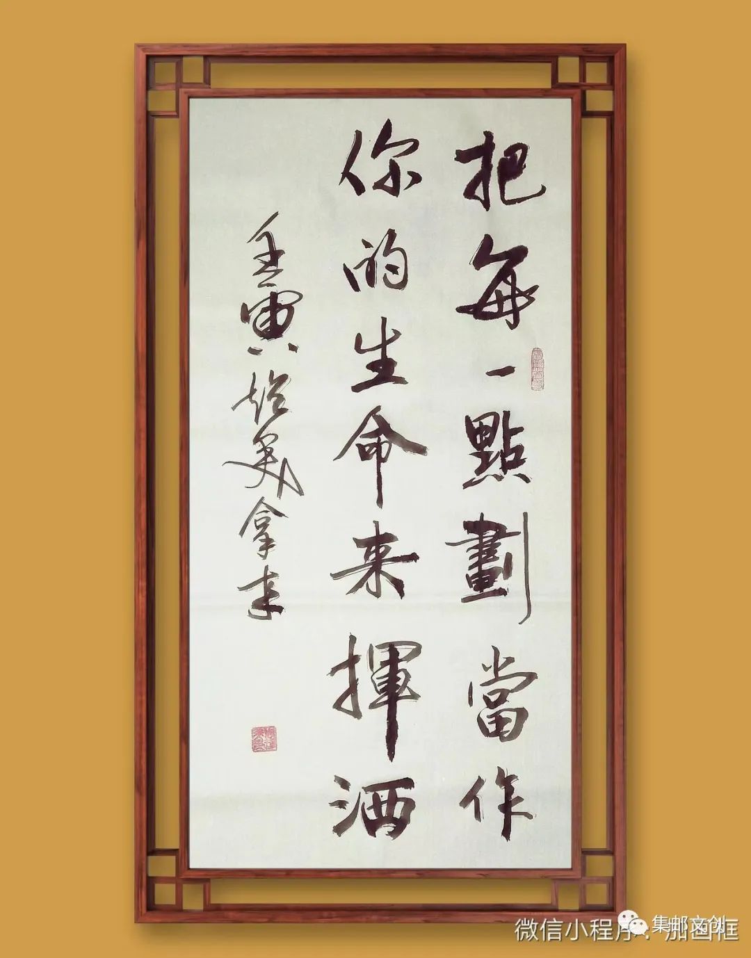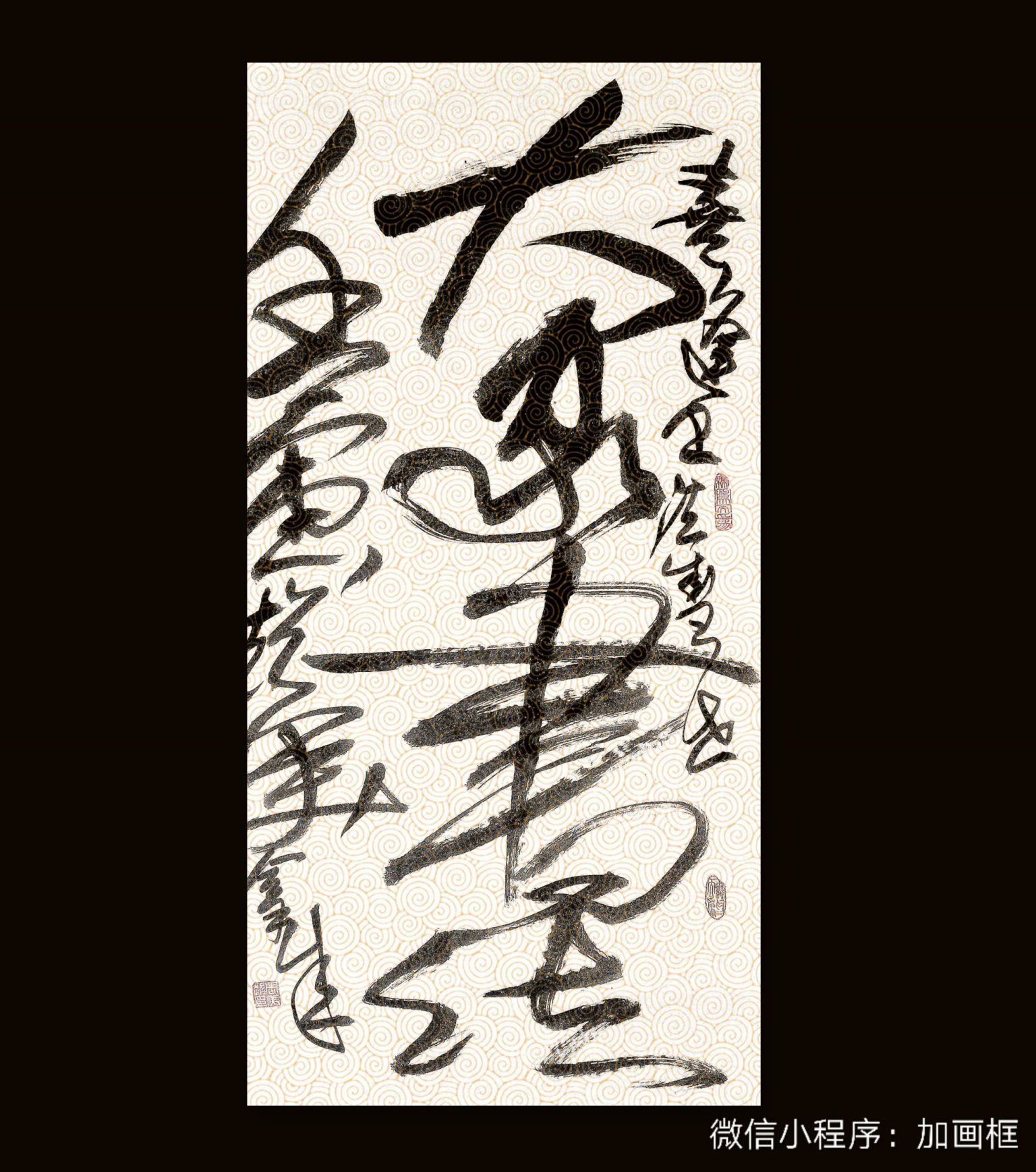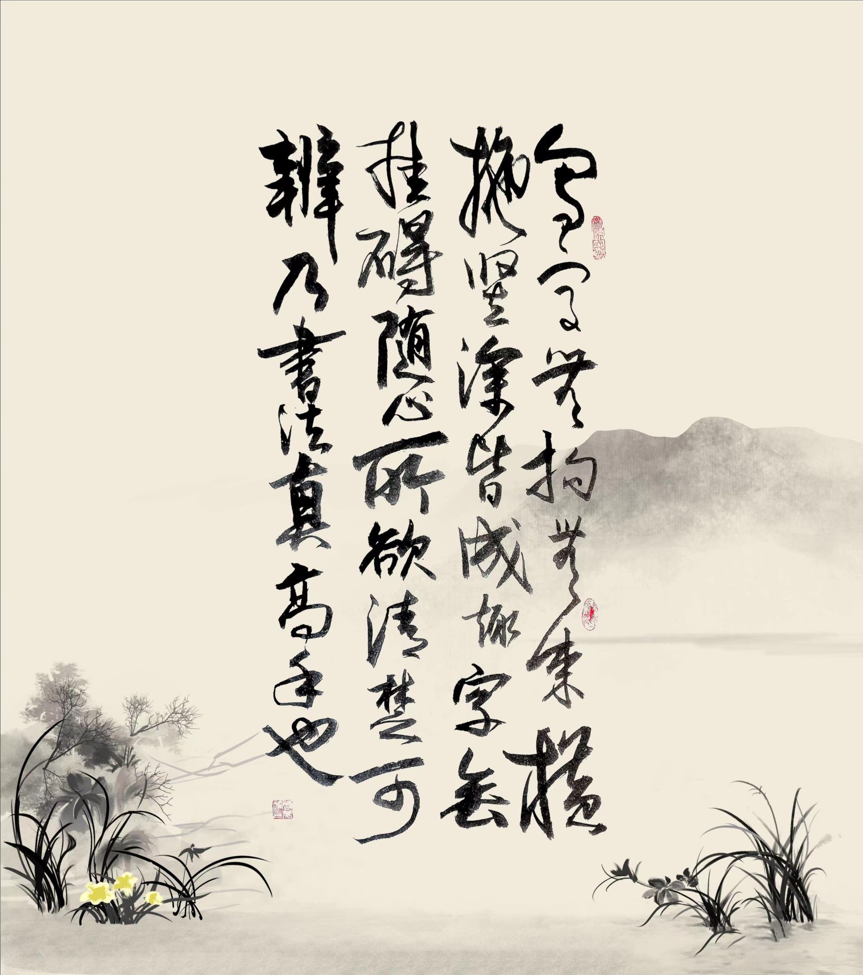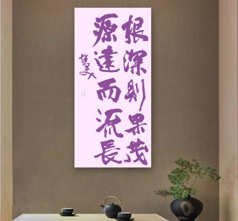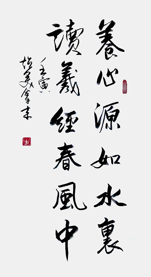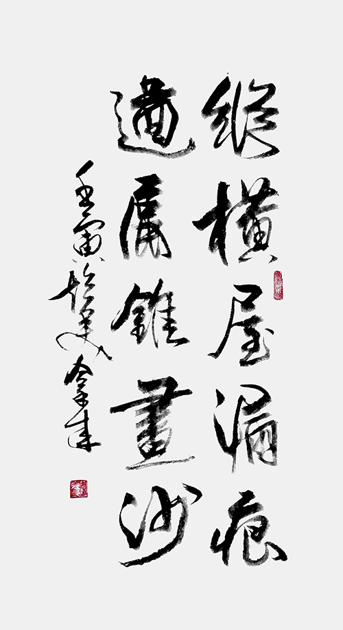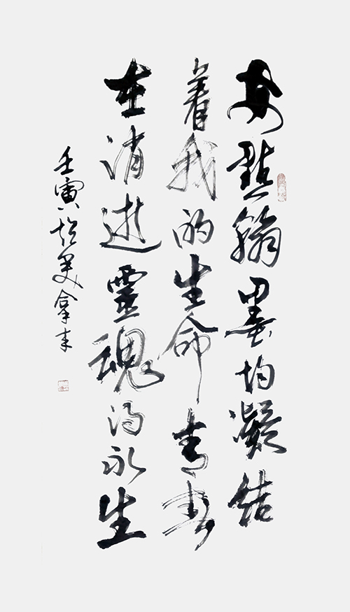 从书法的文化品格上来论,他的笔墨潜涵着传统文化的精髓。以道家的阴阳相和为玄机,笔作阳刚,墨写阴柔,刚柔相济,方圆周备。独阴则不生,孤阳则不长,其书法意象恰谙此论,道法自然。以儒家的进取精神为表现,执笔墨感怀逝者如斯夫,不舍昼夜的激荡,积极进取,笔墨担当。也融入佛门禅意,笔墨不住色声香味触法,依心而作,空鉴从容。笔墨见证真相,唯善从流!这便是他的书法既有技法的精湛,也有文化独见的重要原因,落笔一刹那,妙意证永恒。创新与传承相互加持,让书法的人文精神代不绝人!