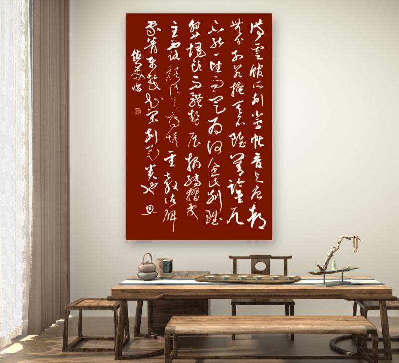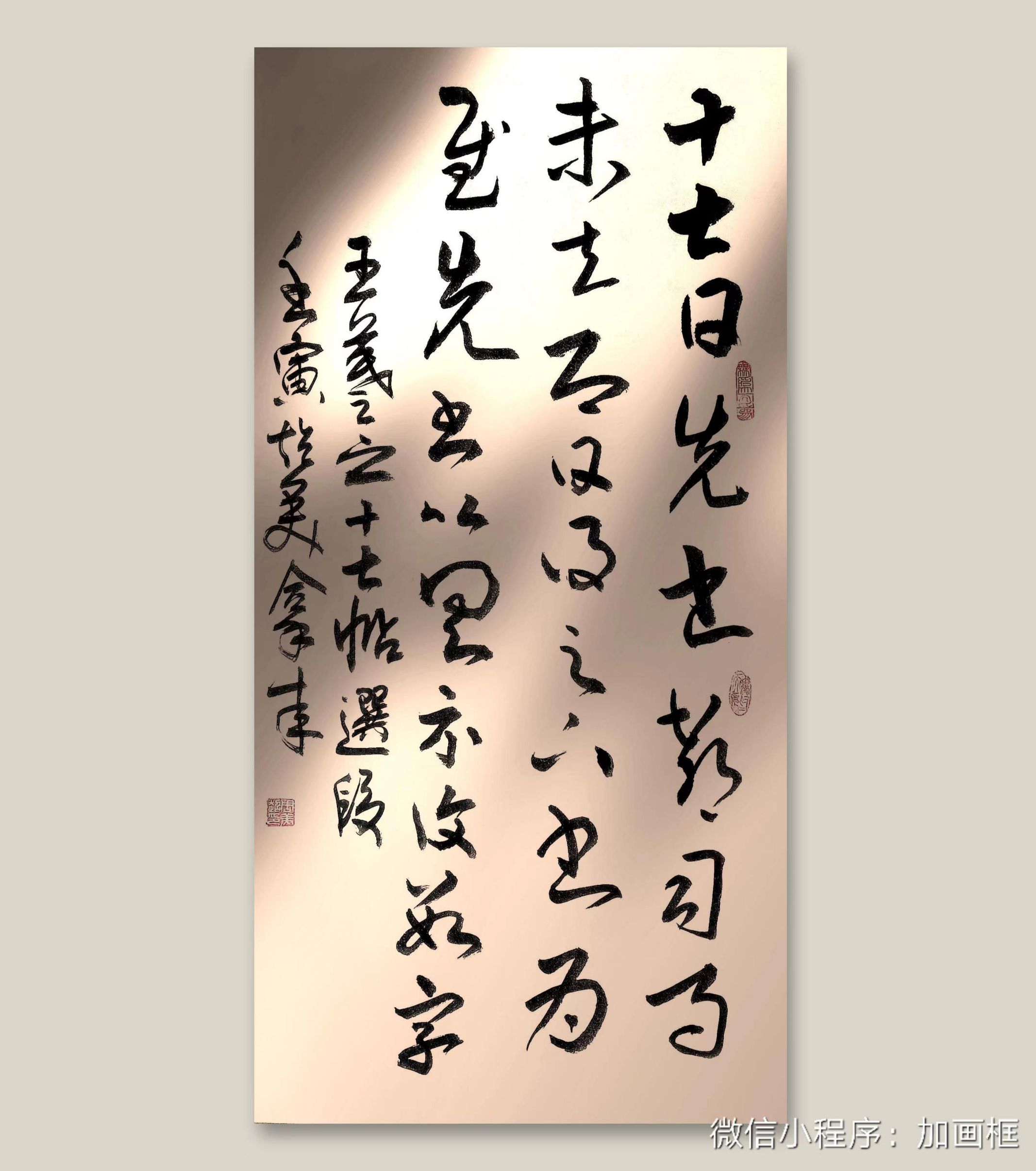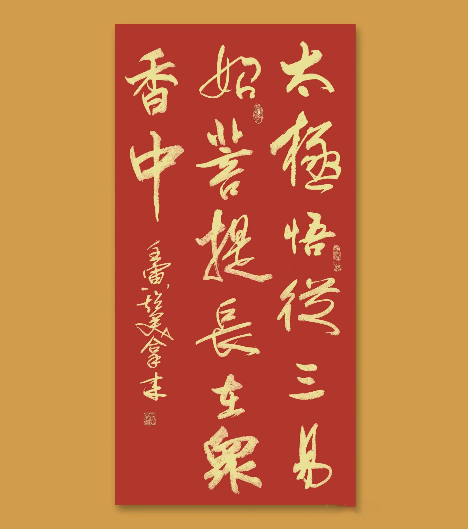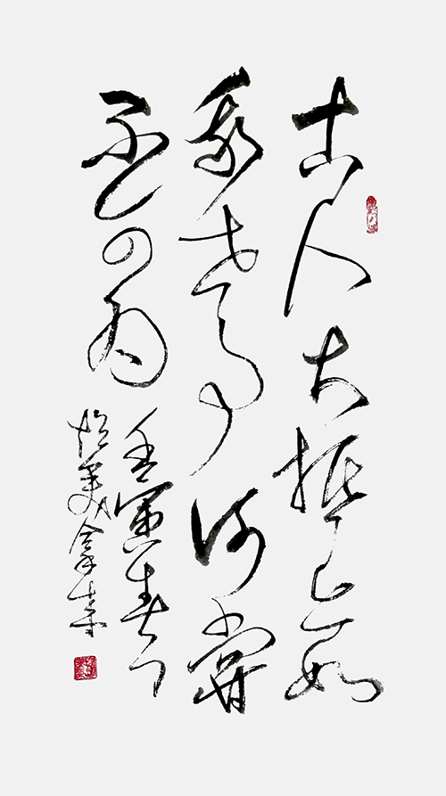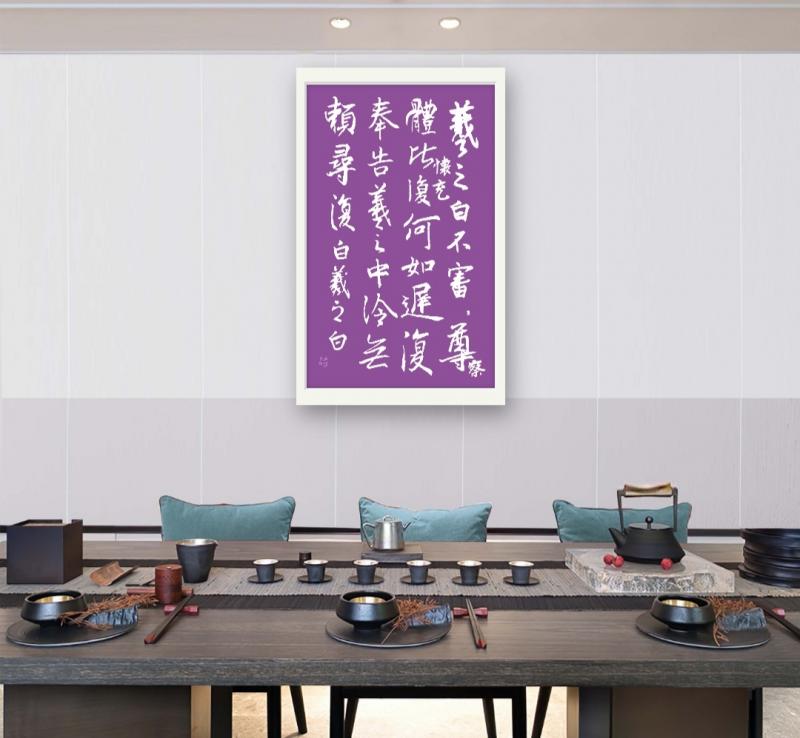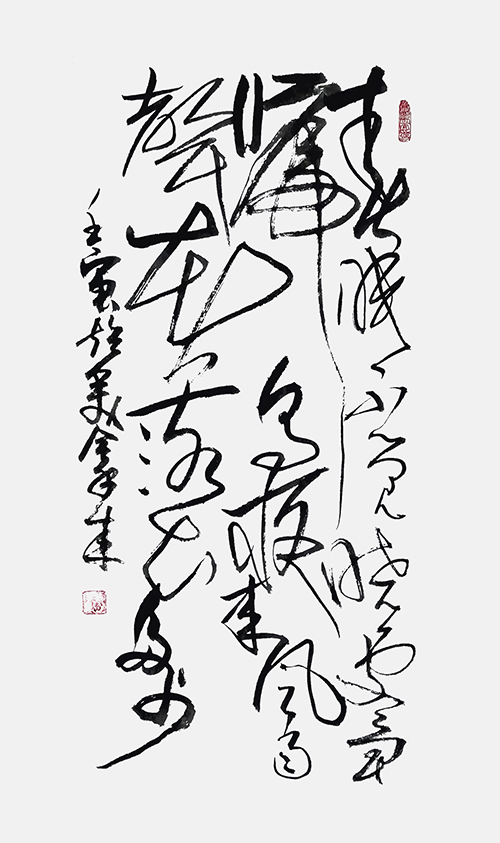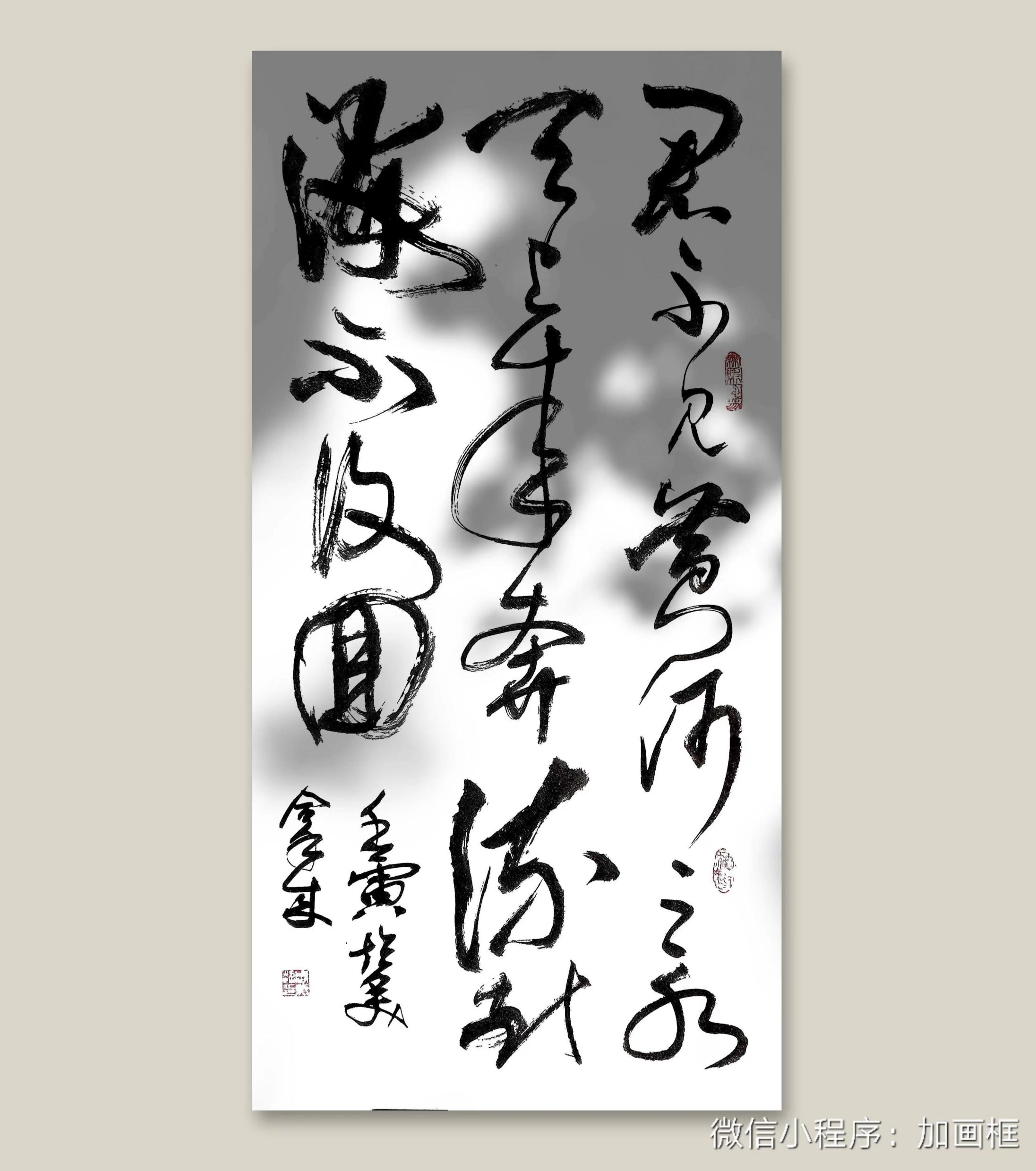 从书法的文化品格上来论,他的笔墨潜涵着传统文化的精髓。以道家的阴阳相和为玄机,笔作阳刚,墨写阴柔,刚柔相济,方圆周备。独阴则不生,孤阳则不长,其书法意象恰谙此论,道法自然。以儒家的进取精神为表现,执笔墨感怀逝者如斯夫,不舍昼夜的激荡,积极进取,笔墨担当。也融入佛门禅意,笔墨不住色声香味触法,依心而作,空鉴从容。笔墨见证真相,唯善从流!这便是他的书法既有技法的精湛,也有文化独见的重要原因,落笔一刹那,妙意证永恒。创新与传承相互加持,让书法的人文精神代不绝人!