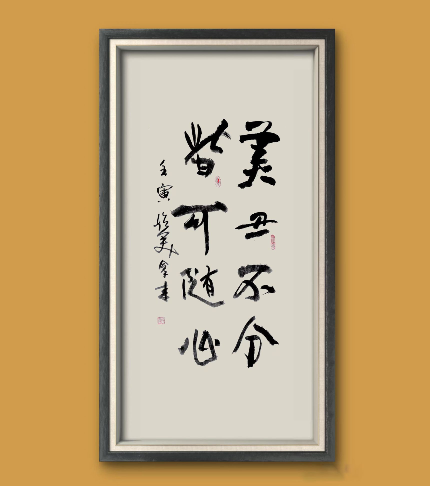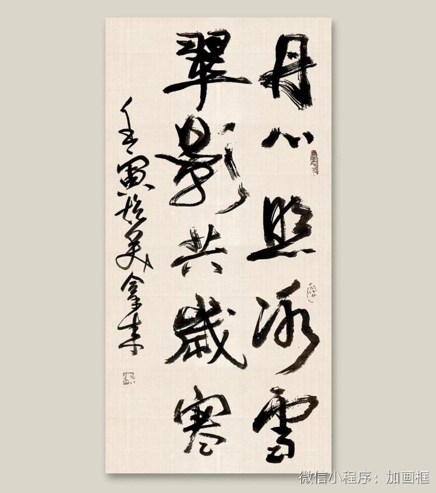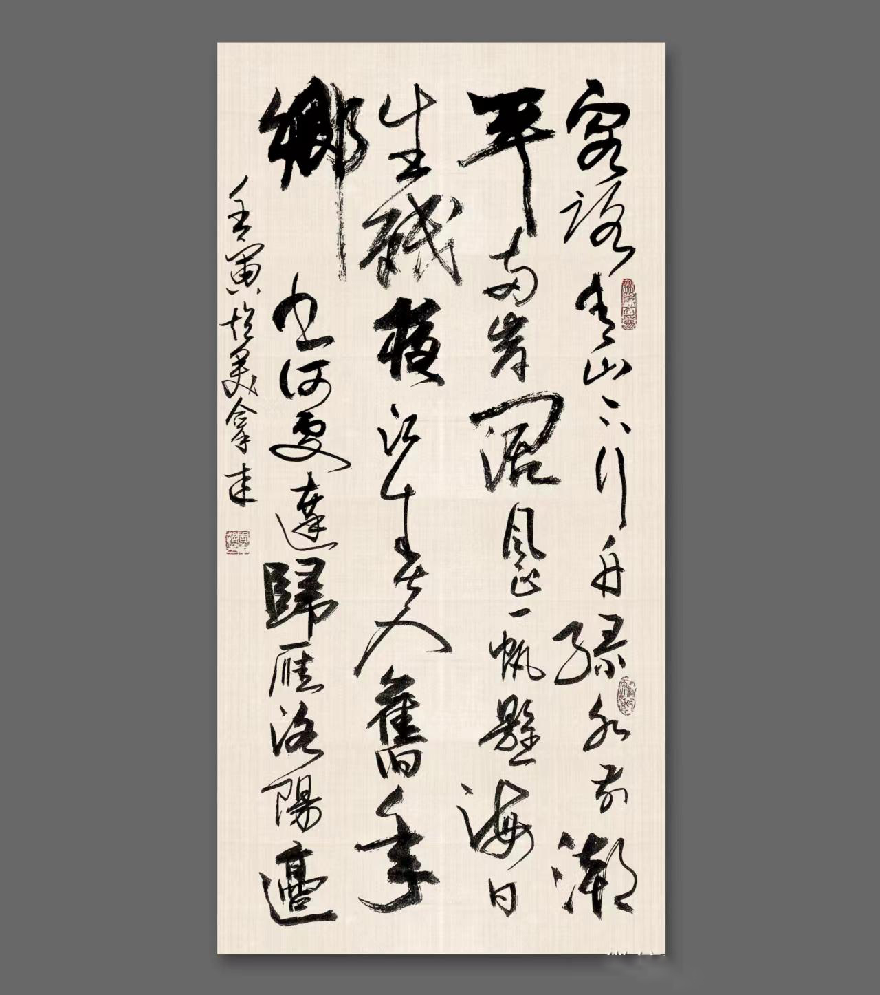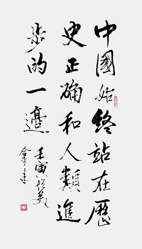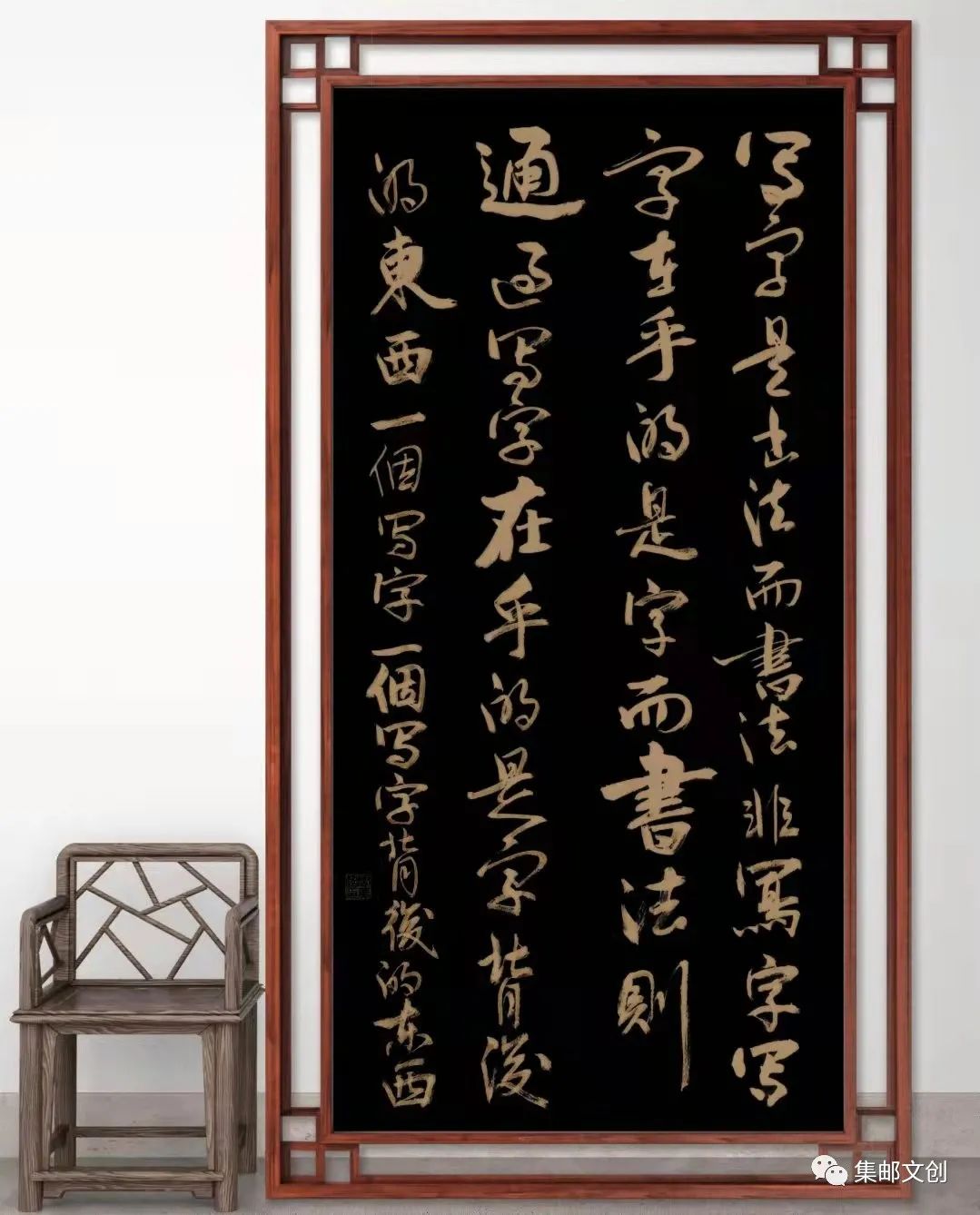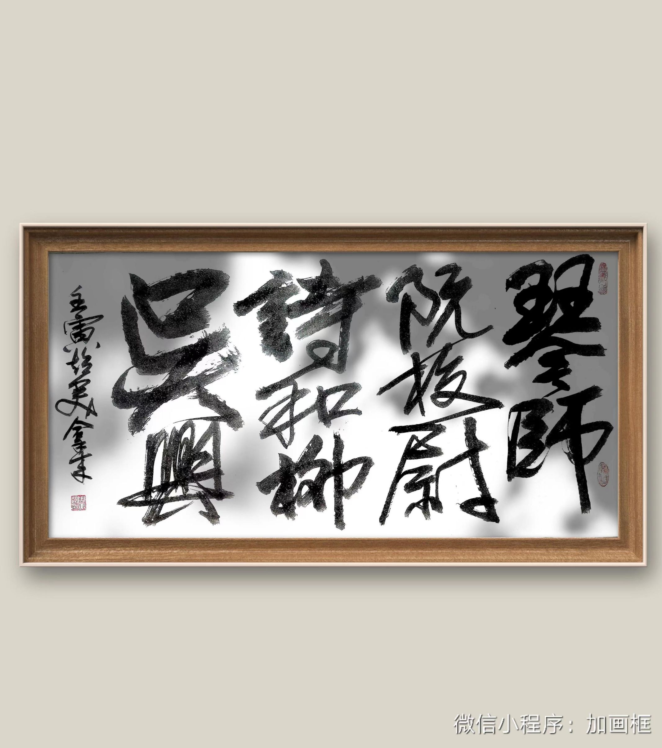 从书法的文化品格上来论,他的笔墨潜涵着传统文化的精髓。以道家的阴阳相和为玄机,笔作阳刚,墨写阴柔,刚柔相济,方圆周备。独阴则不生,孤阳则不长,其书法意象恰谙此论,道法自然。以儒家的进取精神为表现,执笔墨感怀逝者如斯夫,不舍昼夜的激荡,积极进取,笔墨担当。也融入佛门禅意,笔墨不住色声香味触法,依心而作,空鉴从容。笔墨见证真相,唯善从流!这便是他的书法既有技法的精湛,也有文化独见的重要原因,落笔一刹那,妙意证永恒。创新与传承相互加持,让书法的人文精神代不绝人!
