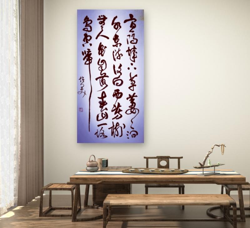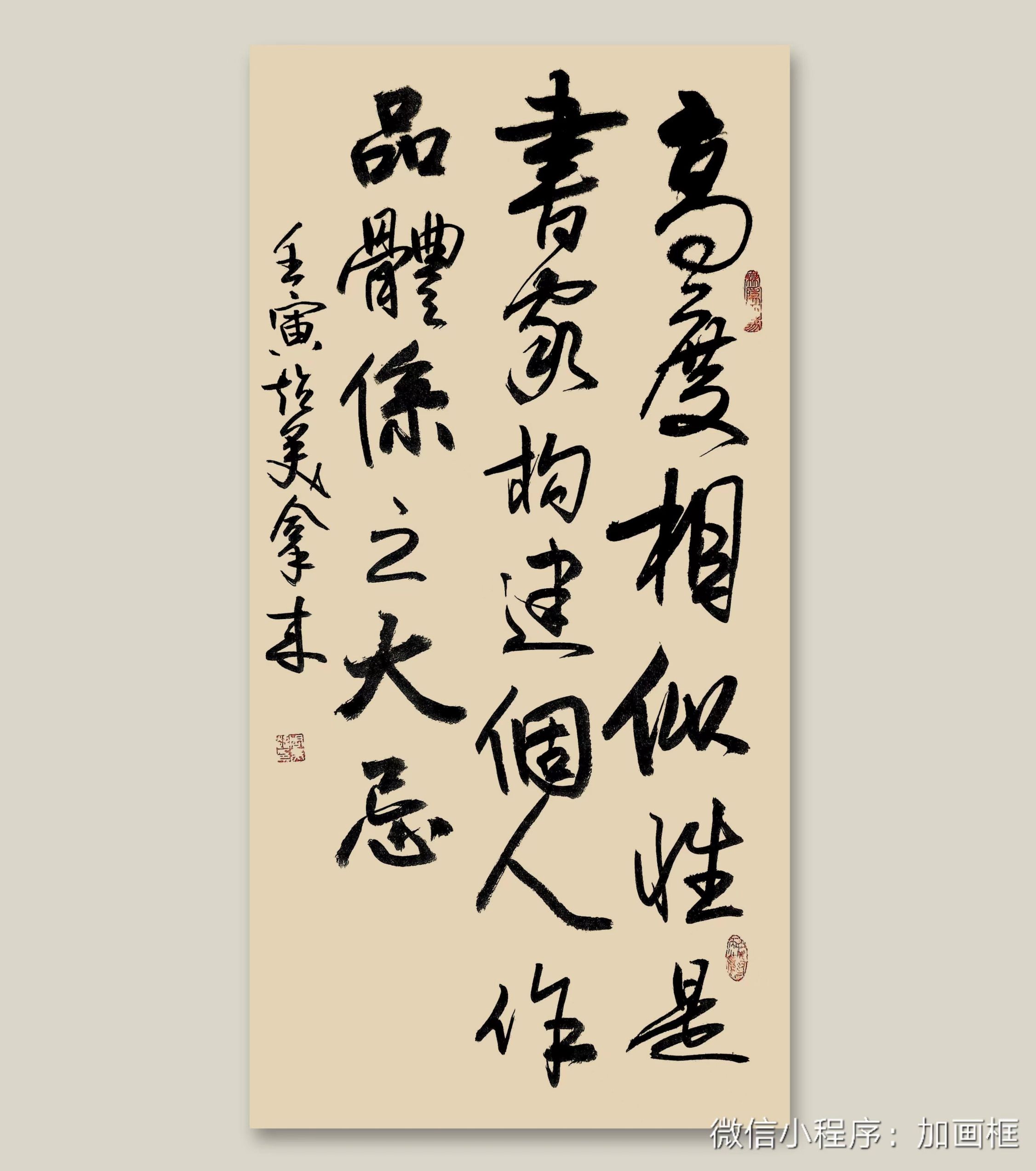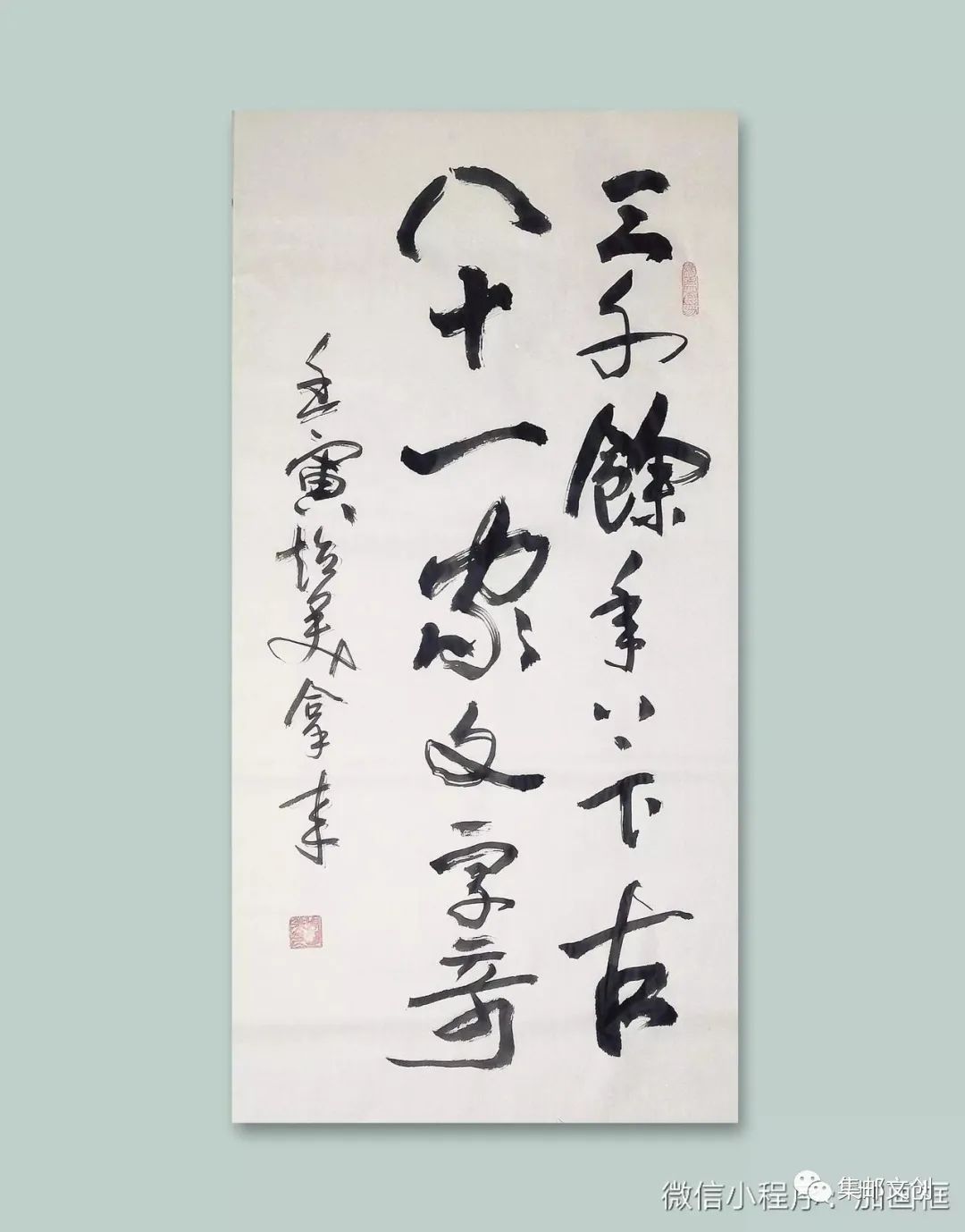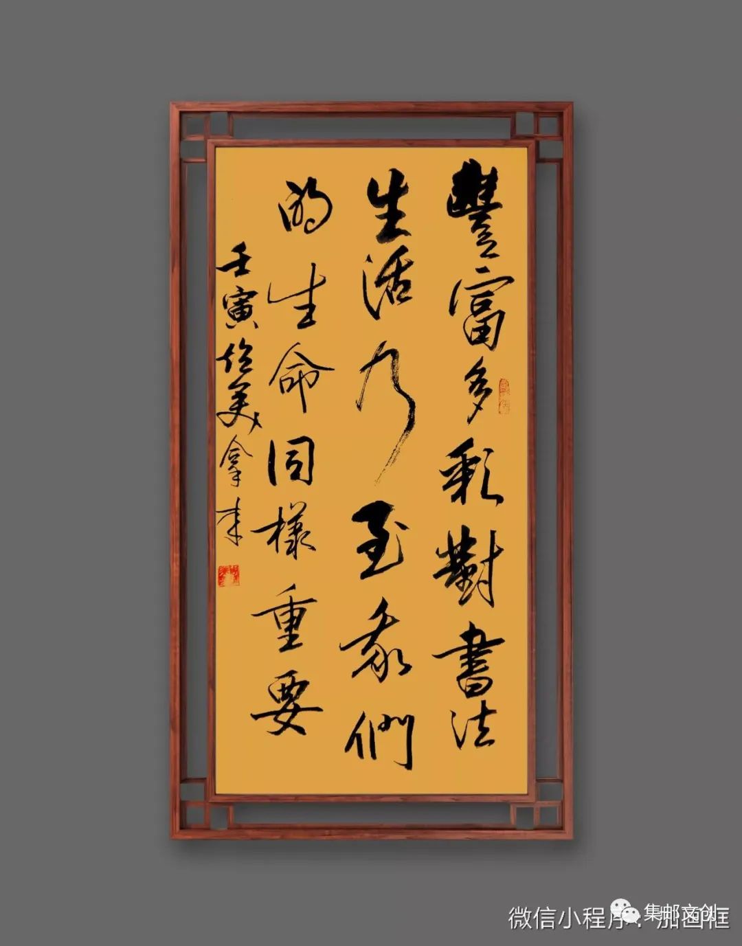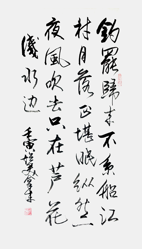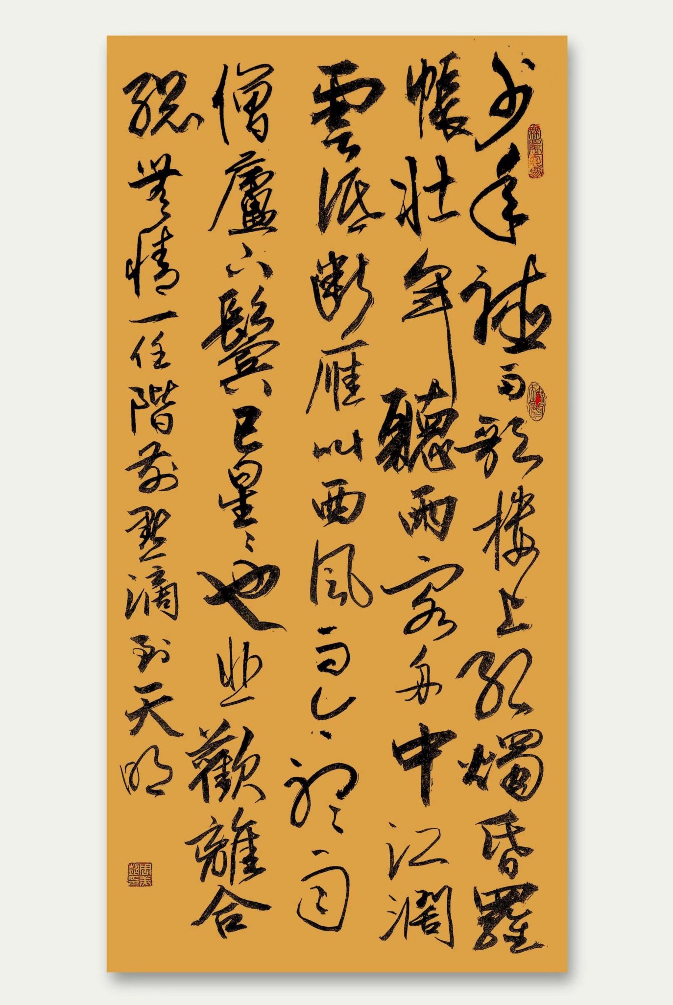 从书法的文化品格上来论,他的笔墨潜涵着传统文化的精髓。以道家的阴阳相和为玄机,笔作阳刚,墨写阴柔,刚柔相济,方圆周备。独阴则不生,孤阳则不长,其书法意象恰谙此论,道法自然。以儒家的进取精神为表现,执笔墨感怀逝者如斯夫,不舍昼夜的激荡,积极进取,笔墨担当。也融入佛门禅意,笔墨不住色声香味触法,依心而作,空鉴从容。笔墨见证真相,唯善从流!这便是他的书法既有技法的精湛,也有文化独见的重要原因,落笔一刹那,妙意证永恒。创新与传承相互加持,让书法的人文精神代不绝人!