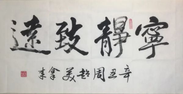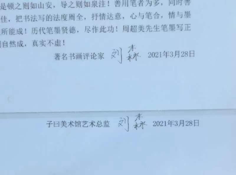 笔立风骨,墨洇华章。先生作书法有笔法的精妙,也有墨法的精彩。浓淡干湿焦,五色焕神。干墨作飞白,湿墨显丰筋,笔里有墨,墨里有笔,前后相随,高低有趣。纤纤乎如新月之出天涯,这是细笔巧墨的情景。落落乎如众星之列河汉,这是顿墨茫涩的塑造。或重若崩云,或轻若蝉翼,果然是顿之则如山安,导之则如泉注!善用笔者为多,同时善用墨者稀有鲜见,周先生笔墨双佳,把书法写的法度周全,抒情达意,心与笔合,情与墨作,写得同自然之妙有,非力运所能成!历代笔墨贤德,尽作此功!周超美先生笔墨写正宗,其造诣闻达八方,果然功到自然成,真实不虚!
