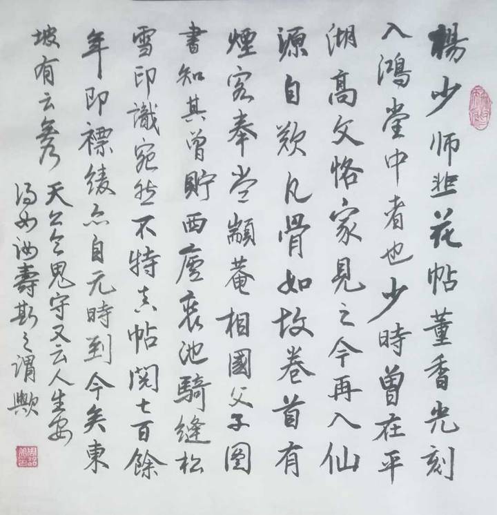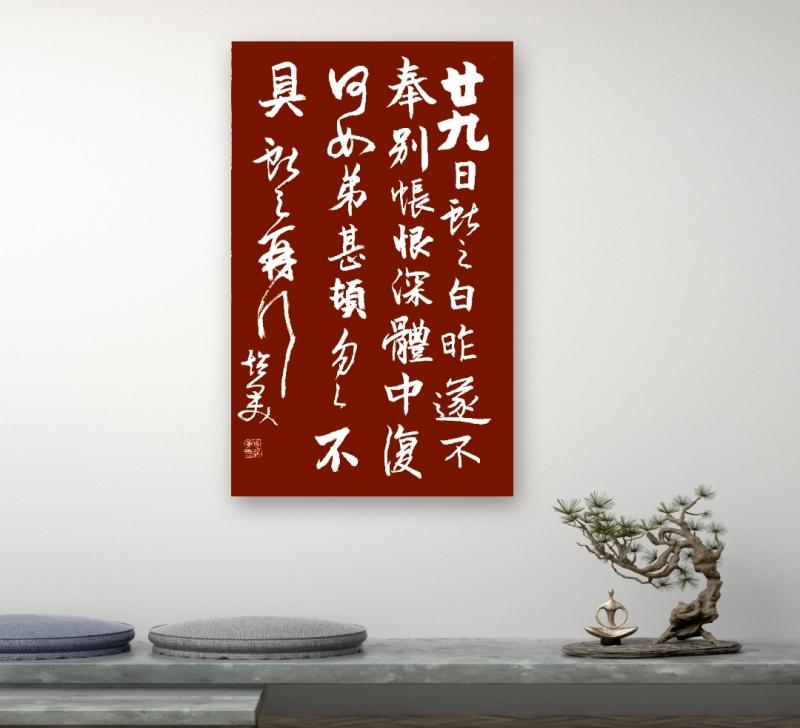 纵观其行草作品,其法有来源于兰亭序、伯远帖、快雪时晴帖的儒雅内涵,也有来源于自叙帖、古诗四帖的气势浩然,还参意了研石铭、蜀素帖的笔墨痛快,取法历代贤家法帖,经过心追手临,把隐藏在法帖之中的秘籍琢磨透彻,作出了融会贯通的表达,所以写得如飘风骤雨惊竦竦,亦如落花飞雪何茫茫!这一手类万物之象的行草作品,恰可以依书抒情。情绪激越之际,写龙跳天门虎卧凤阙。情绪适逸之际,写鸾凤徘徊,激楚浪以成文!