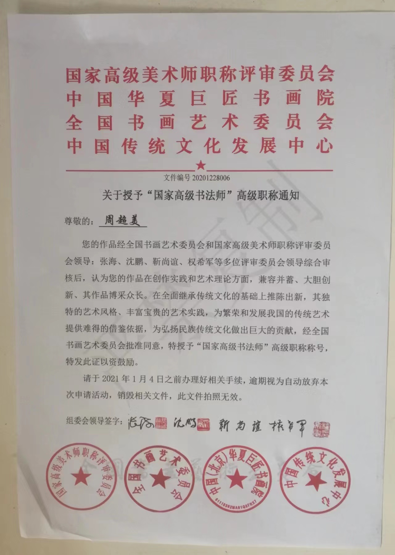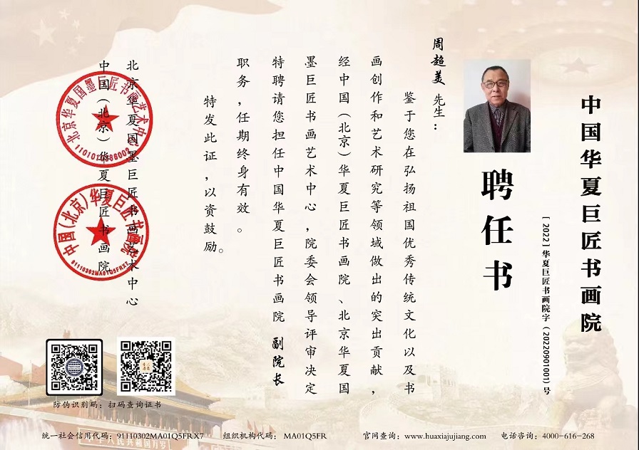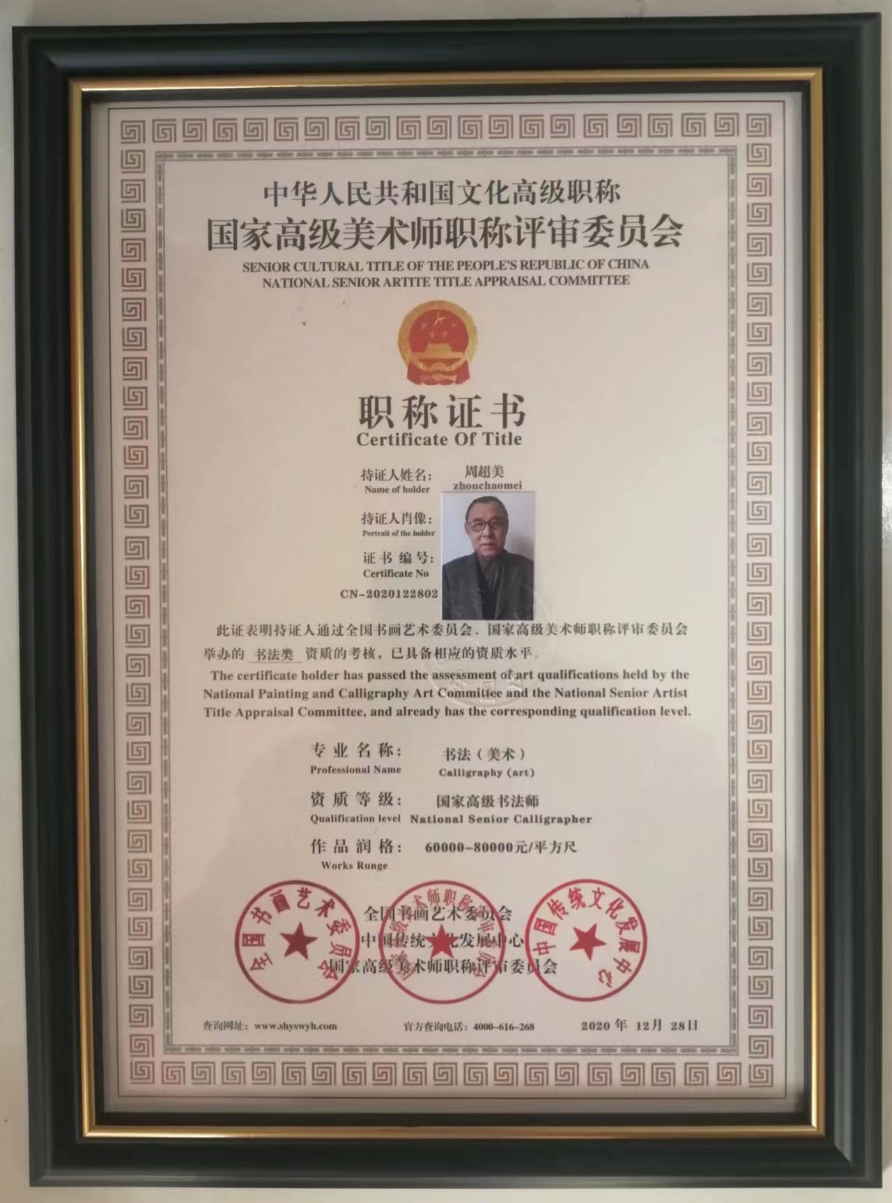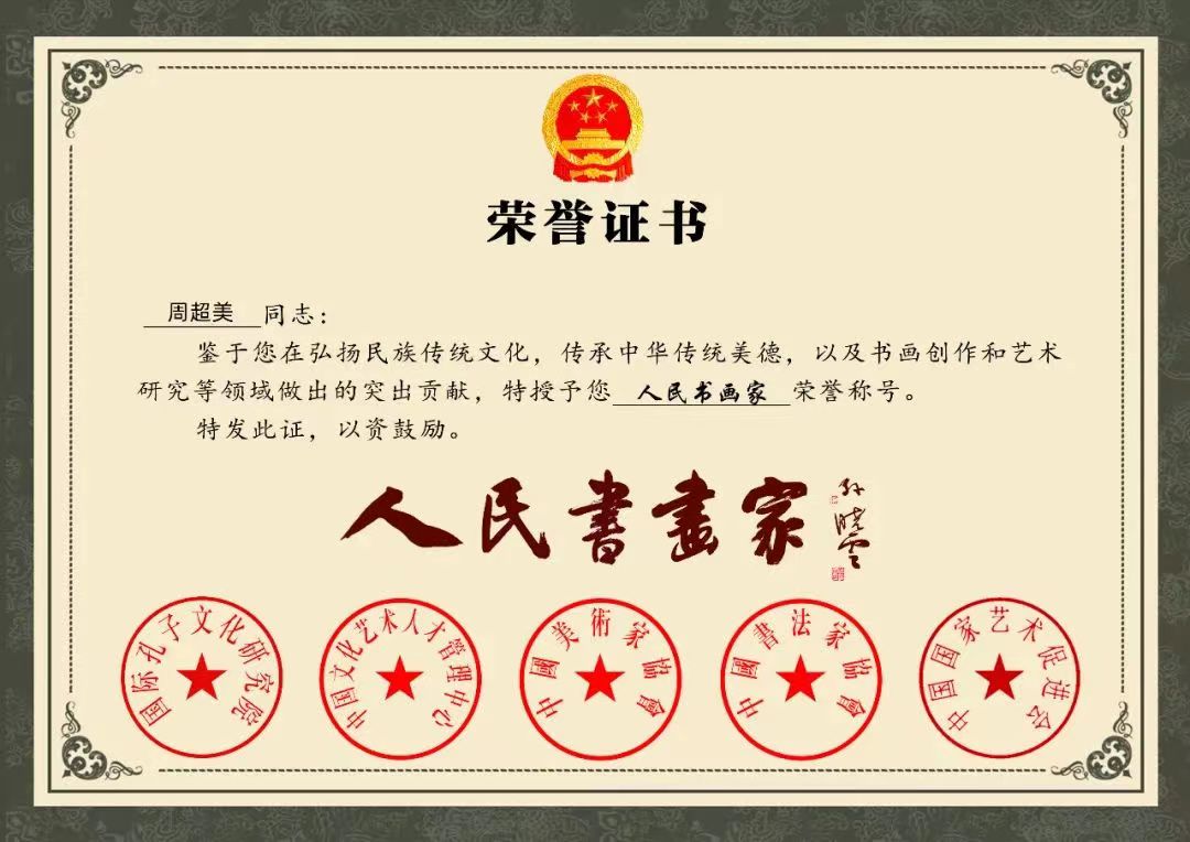 周超美,1958年出生于安徽省合肥市。全国书画艺术委员会副主席,中国人民书画家,自幼喜爱书法、楷隶篆行草五体皆书,尤爱行书和草书。几十年来遍临古今大家,以万字不同,每幅各异为追求目标。经几十年磨砺独成个人风格。字体多变随心所欲,笔下流出对书写内容的所思所感,使书法和书者情绪相连相通。经几十年的努力取得了一些成绩,得到了一些专家收藏者的认可,现为全国书画艺术委员会副主席,国家高级书法师,中国书画院院士,中国乡协孔孟文化研究院理事,子曰美术馆艺术委员,在中国共产党诞辰100周年之际被官方权威部门授予“人民艺术家”荣誉称号。