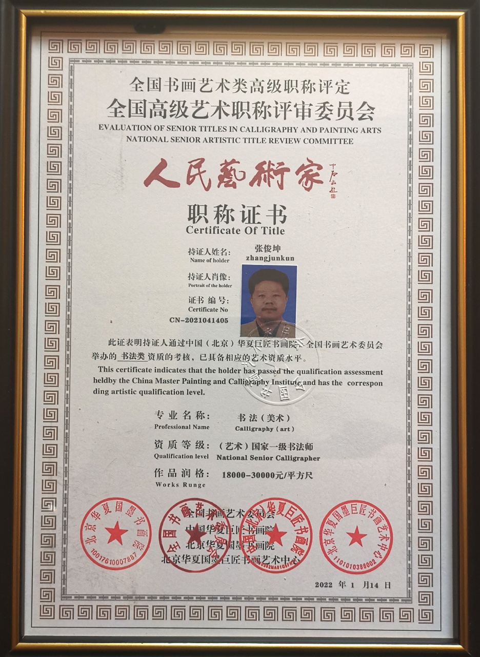 2021年被中华人民共和国国家书法师职称审定委员会评定为“国家高级书法师”并获得荣誉称号,同年被评为“德艺双馨人民艺术家”书法作品获得2021年“百家争鸣杯”全国书画艺术大赛特等奖。