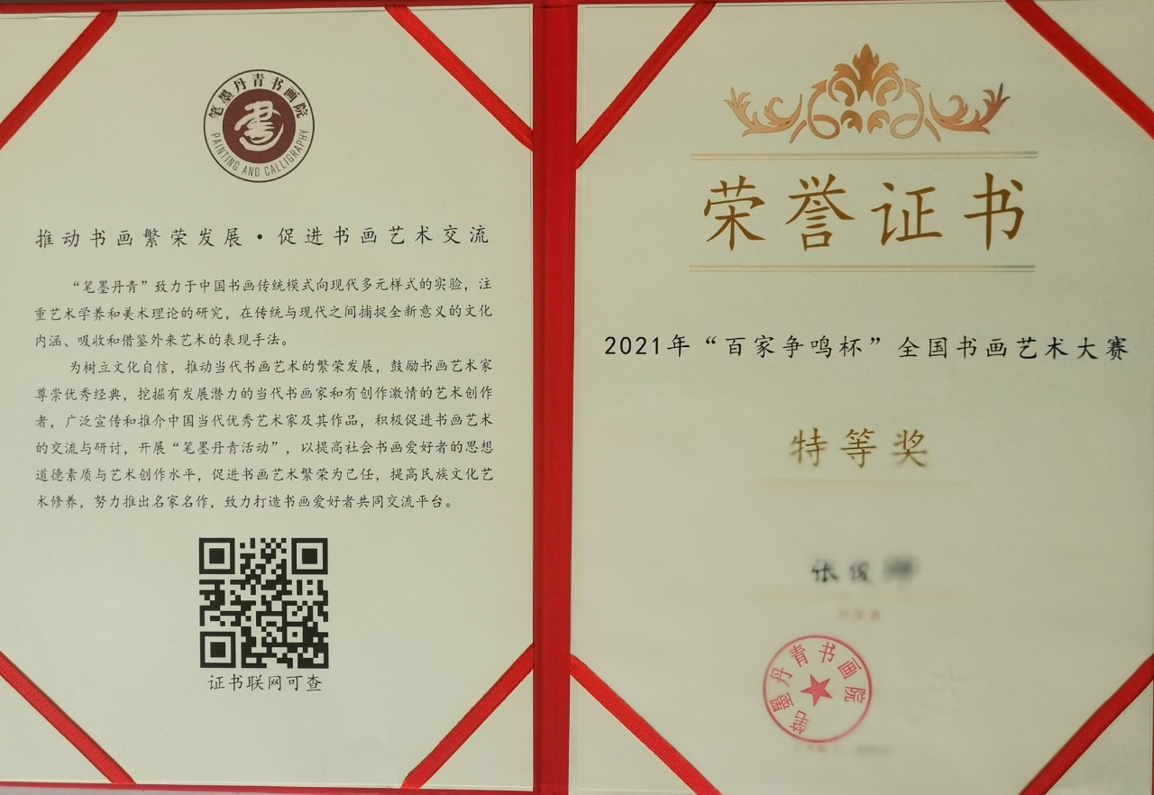 书法作品获得2021年“百家争鸣杯”全国书画艺术大赛特等奖。