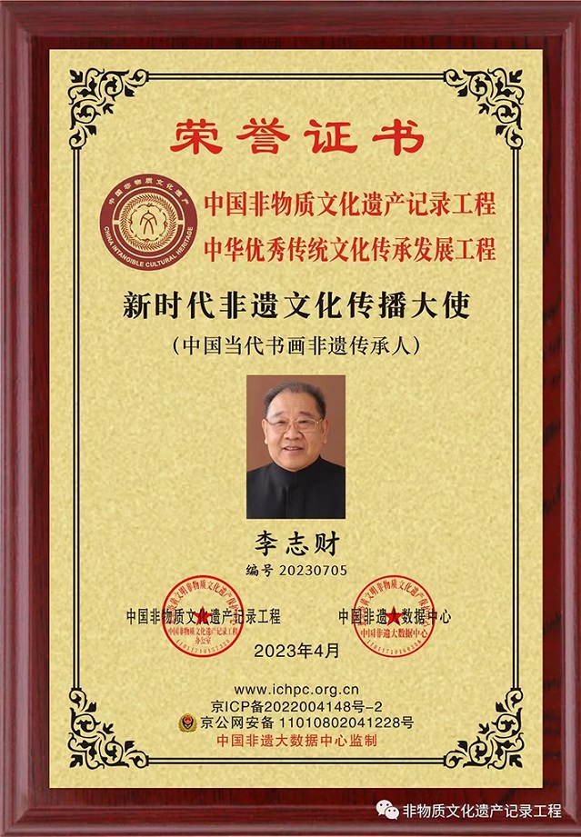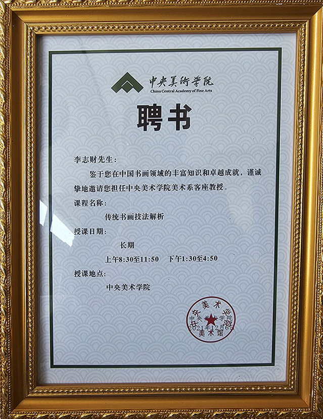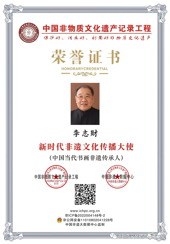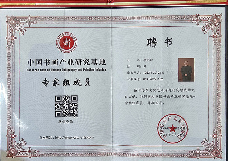 李志财先生先后担任中国书画界联合会理事、中央国家机关书画委员会主任、中国文化遗产保护研究院总顾问、中国书法评审润格委员会专家评委、文化艺术发展委员会总顾问、中国清风书画协会执行主席、最高检文联书画协会主席、中国书画评审润格委员会评审专家、世界东方书画院执行院长、中华清风杂志社常务副社长等众多社会职务以及北京工商、北大、内蒙古大学等多所高校客座 教授。独特的艺术风格得到了国家和省市领导以及海内外书画艺术大师、专家名家的一致认可和 高度赞赏。
