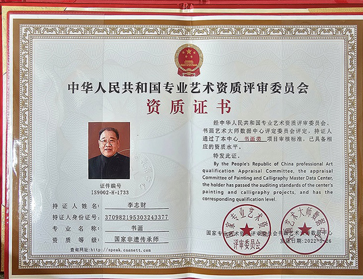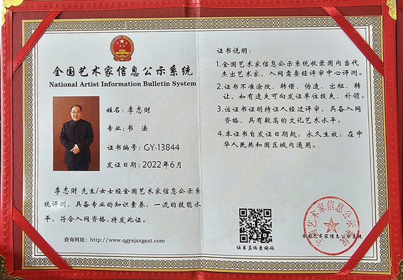 李志财,著名书画家,1953年出生,笔名泰山人、中南海书生。现为中国书法家协会会员,中国美术家协会会员,国家一级美术师,国礼艺术家,国际艺术品评估师,亚洲杰出艺术大师。