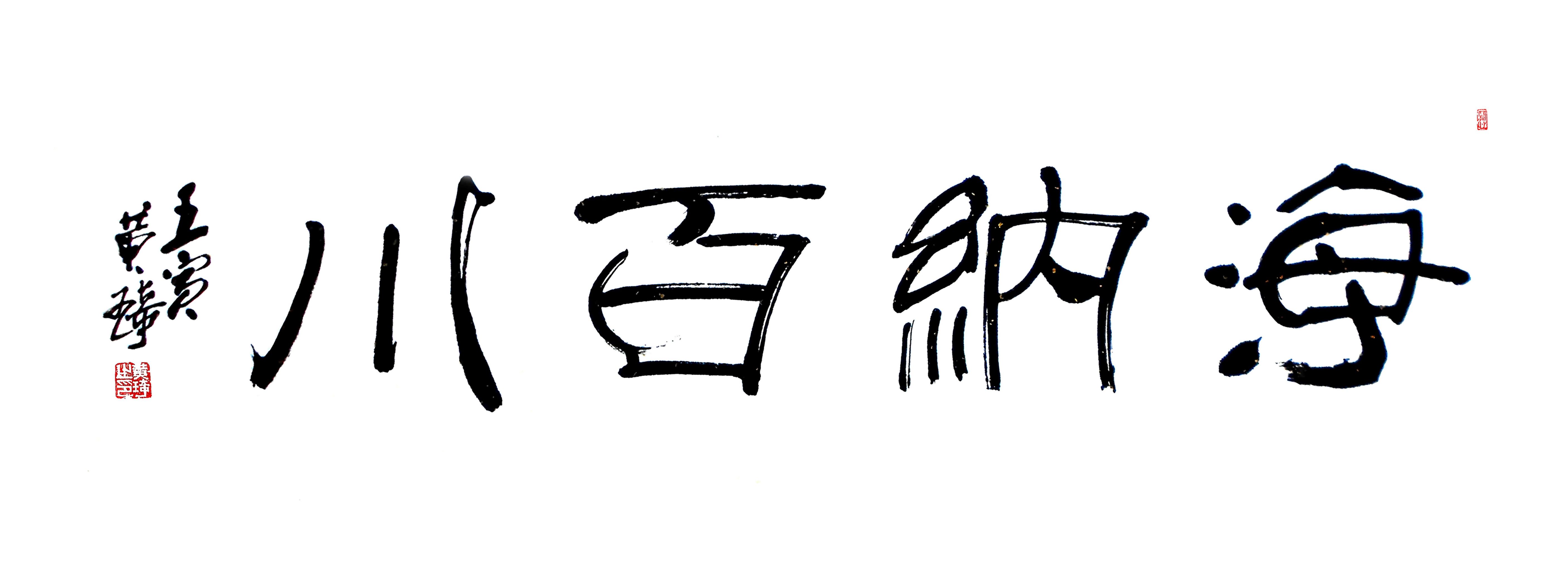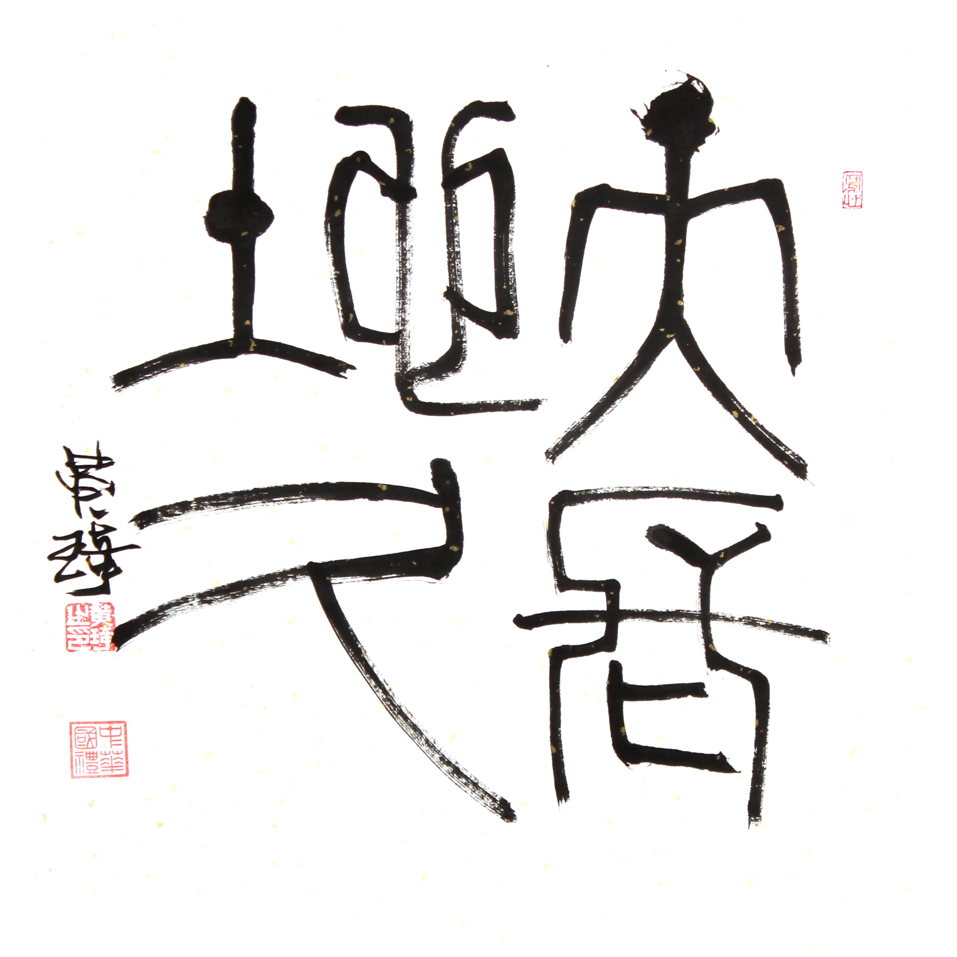 首观先生篆书作品,其篆法胎息秦之根基,但又不失于 自我风格的蕴藉,因此无论是从篆书的笔法上来看,还是从 篆书的取势上来看,我们都是能很明显的感受到一种师古不泥的翰墨之风!作品中篆书用笔,是可见得方笔之刚健,字势布局平整,线条亦是松弛有度,纵览之余,诚可谓是方圆之间收发自如,奇正之间落笔有力也!而在行草和榜书书法