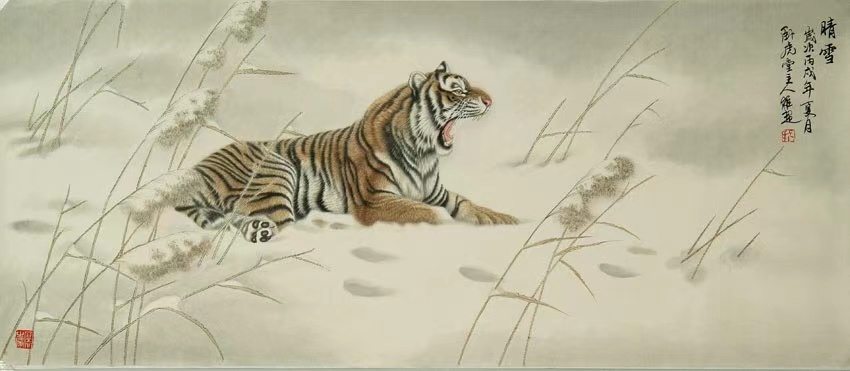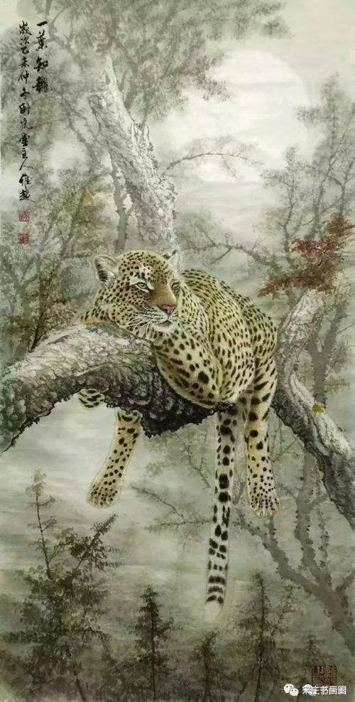 吕维超描绘的野生动物带给观者的并不是惯常所理解的单纯的威猛、野性、或者是像西方美学所形容的具有极强距离感的“崇高”。也许是为了中和背景的荒寒,他笔下的动物反而常常显出几分稚趣可爱。如他会将老虎安排盘卧在树上,老虎的骨肉线条强壮有力,表情却透着几分温情,尤其是在树上这一环境设定,给老虎增添了几分颇似“大猫”的气质。这样的安排也令构图形成一种微妙的关系,创设勃勃生机。不得不说,画家是个很有趣的人,他高超的绘画技巧始终是为内心世界的丰盈活泼而服务的。再比如他的《寒林暮雪》,狼的凶猛似乎消弭在那嘴角的弧度之中,仿佛这匹狼在冲我们微笑一样。我们看到的是矫健的野生动物,同时似乎又有了几分灵气,甚至能与画者、与观者达到精神上的共鸣和契合。