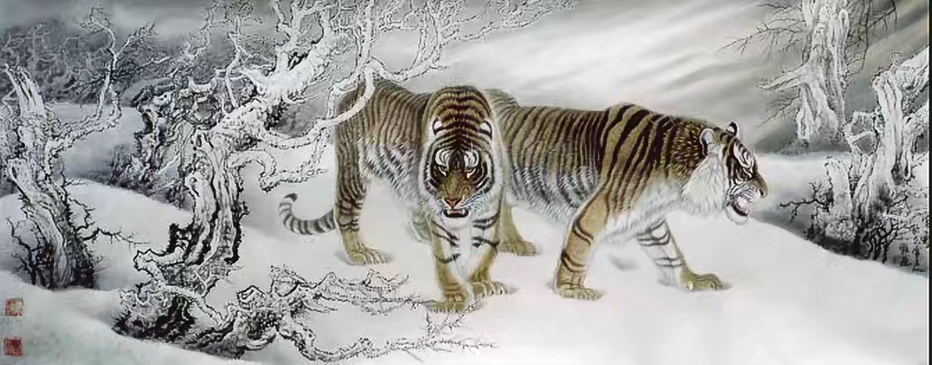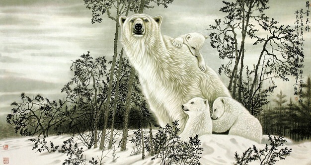 值得一提的是吕维超动物画的背景营造,这也是他富有诗意情趣的画面格调的重要因素。就像《涤魂之地》所表现的那样,白熊在皑皑白雪中闲庭信步,其身上的毛发生长方向带有一种书法线条般的美感,既为了塑造白熊形体服务,同时也是中国画笔墨意趣的体现。更奇妙的是背景中的白雪、冰块,这一背景处理不仅带有较强的体块感和图案性的装饰美感,同时又似乎与立体主义异曲同工,与自然造物既存在明显不同,又能抓住自然事物的精髓,达到心物一体的境界。背景颜色处理按照今天的色彩理解是“黑白灰”,放置于中国古典色彩和绘画美学中,则是“运墨而五色具”。吕维超在许多画作中都运用了这种雪景寒林式的处理方法,比如《快雪时晴》这幅作品,猛虎身处苍老枯劲的草木枝丫之间,背景色彩不多,多为素白,但于纵深和空间感的营造方面仍然是不遗余力的,北方冬日雪后那清幽静谧的气氛也体现得淋漓尽致,氤氲的水墨天空仿佛笼罩着一层雾气,颇有意大利文艺复兴时期威尼斯画派的薄雾质感。吕维超便是这样,他把动物画活了,即便在那些“没有形”的地方——如背景的杂花草木、天空、日月星辰、水汽,画家仍然能达到对“神”的把握,既创作出为大家所喜闻乐见、倍感亲切可爱的动物形象,又能营造冷寂自省的文人气质。