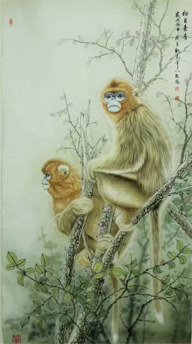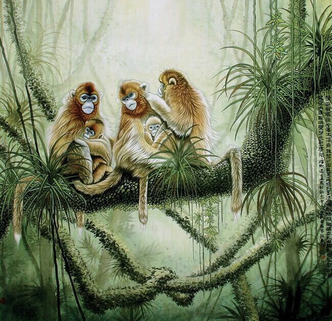动物画的手法技巧具有一定的特殊性。野生动物身材圆浑雄壮,皮毛又厚实,许多画家在描绘的初期便太过注意对细部皮肤毛发的刻绘,而忽略了内在的坚实结构,犯了谨毛而失貌的错误。但吕维超很好地规避了这个问题,他画的老虎、狼、猿猴,尽皆结构准确,毛发细节的刻画也一丝不苟,尽管经过层层描绘、上色,但仍然灵动精巧而不显厚重,和动物自身、动物所处的背景的整体气势达到和谐,粗中有细,疏密得当,这是很考验画家的手头功夫的。要想达到这般技近乎道的境界,需要对各种野兽做细致的观察,从外在的皮毛质感,到内在的肌肉筋骨,更要观察动物的静态和动态,以及对其习性特征进行把握。只有这样,才能达到我们中国传统绘画美学中所追求的“神”,做到以形写神、悟对通神。举例来看,在《丹崖流泉》《浩荡秋风》《静看夕阳》等作品中,吕维超对老虎皮毛质感的处理便甚是精妙。老虎颈部的长毛、脸部的短毛和腹部更加短的绒毛,都各有区别,组织在一起又相得益彰,共同构造出老虎雄健的身躯。