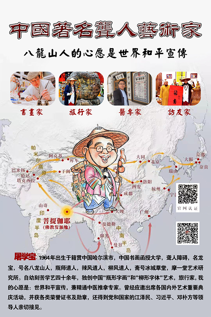 屠学宝,名龙宝,号名八龙山人,瓶师道人,辣风道人,斋号冰城草堂。中国书画函授大学毕业,1964年出生于中国哈尔滨市,著名聋人艺术家,旅行家,医专家,访友家,我的心愿是:世界和平宣传。