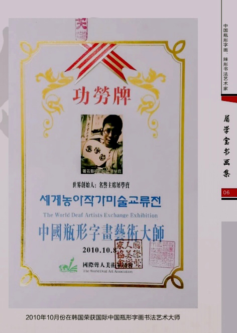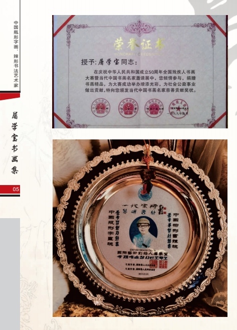 自幼刻苦学艺四十余年,研成中国"瓶形书画"和"柳形字体"和"太极字画"艺术之创始人,兼精通中医推拿专家。现任摩一堂艺术研究所兼职担任大韩民国国际聋人美术家协会名誉主席、韩国国际世博展览馆《中国瓶形字画大师屠学宝》、日本东京世博展览馆《中国辣形字体展一屠学宝》、马来西亚吉隆坡美术家馆巜八龙山人画展一屠学宝》、中国台湾博物院高级书画家、中国国学文化研究会会员、中国中外名人文化研究委员会名誉主席、全国残疾人书画家协会会员、哈尔滨市道里区聋人协会名誉主席、曾经应邀出席各国内外艺术重要典庆活动,并获各类荣誉证书及勋章,还得到党和国家的江泽民、习近平、邓朴方等领导人亲切接见。