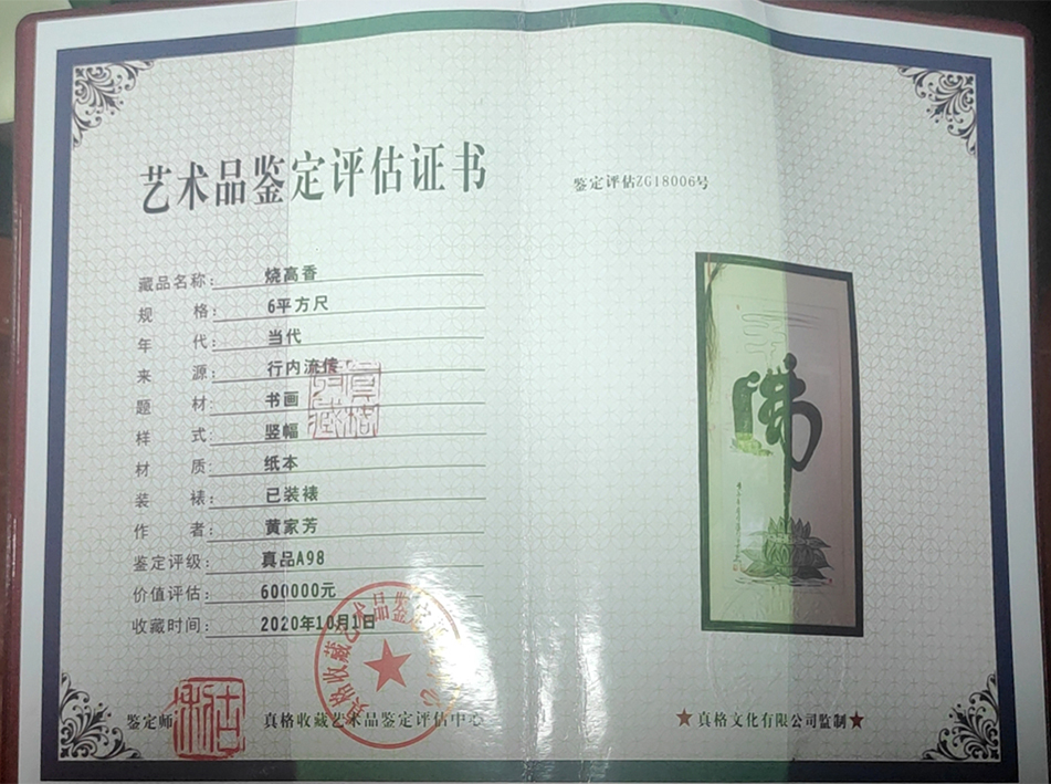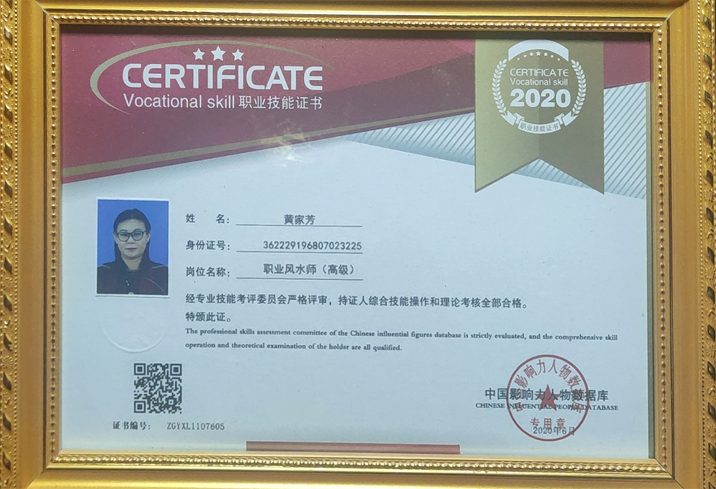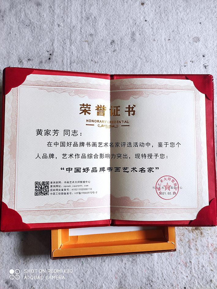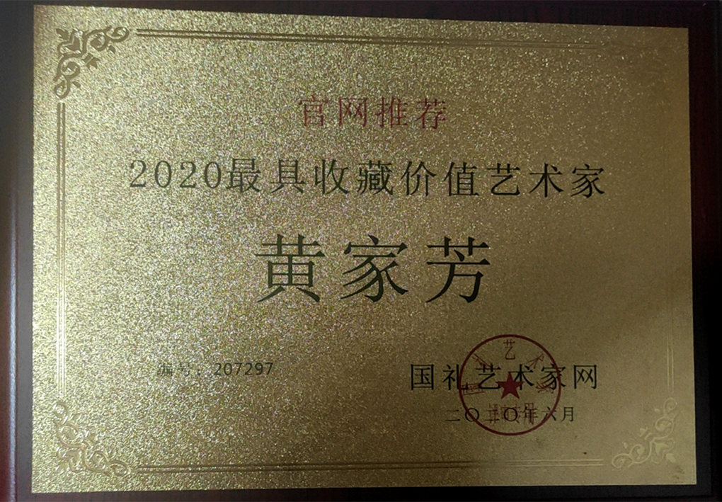 2019年在书画领域有卓越成就,授予二0一九年华人书画艺术年度人物;获得中华人民共和国艺术职称国家美术师职称证书;传承书画人物黄家芳,编号:SHCC一6386.经传统文化艺术非遗传承中心评审,执证人具有传承书画人资质,特颁此证。勤奋拼搏,学无止境,又拜师泉州大学林教授学习国画。