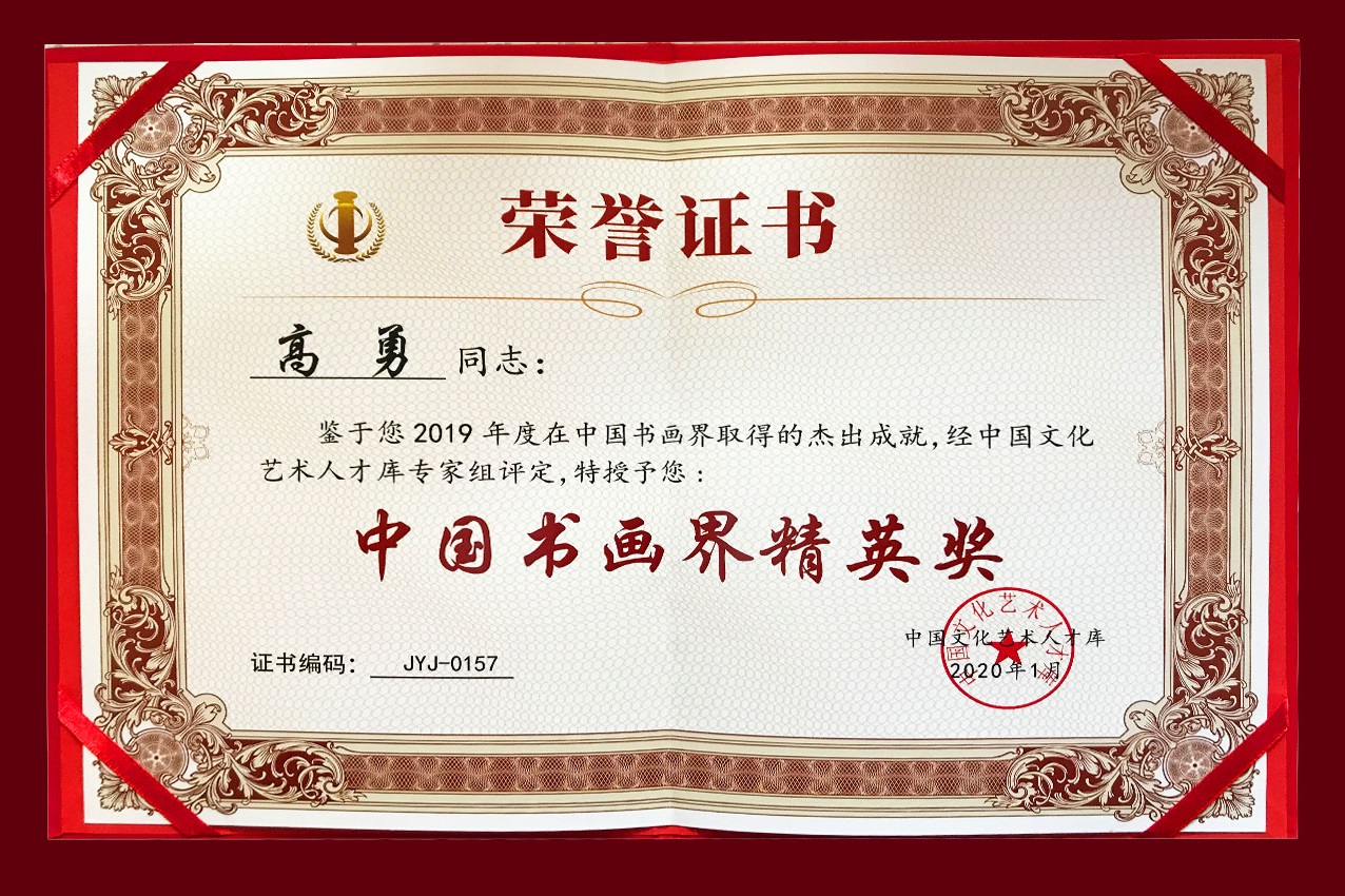 2019年度在中国书画界取得杰出成就经中国文化艺术人才库授予中国书画“精英”奖。
