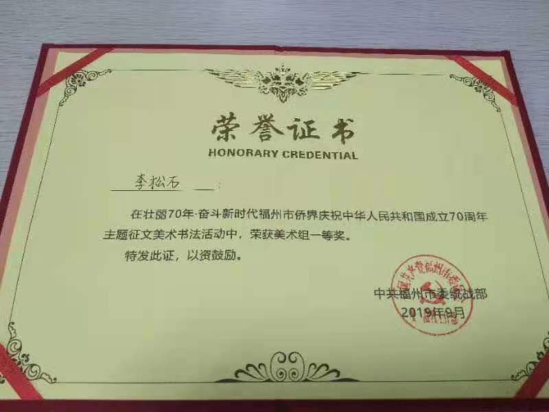 福建省侨办组织的庆祝国庆70周年国际征文大奖赛中获得美术组一等奖。