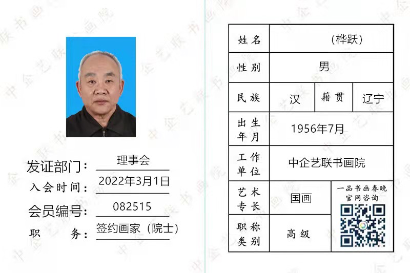 中美协会员,国家一级美术师,中国美术家协会辽宁省美术家协会会员,清华美院新水墨高研班研究会会员,中国书画研究会会员,中国华夏万里行书画家协会会员,自幼喜爱绘画,毕业于鲁迅美术学院,系统学习传统绘画知识,油画,桦跃老师的作品深受专业人士及大众的好评 ,学习古典印象派写实油画技法桦跃老师的作品,以多表现花卉果实之类古典写实油画动物,风景画作品为主。有缘结识孙其峰老师,学习花鸟写意技法,能与孙其峰老师有深厚学习机会,得到艺术上的造意深厚基础,深受清华美院王奇寅老师的精心指点,学习新水墨技法深造,勤学苦练经多年专心学习研究学习成绩优越,国画山水画,近年来参加国内外大型画展,并且荣获多次全国大奖金奖等各类奖项,作品远销海内外,部分作品被海内外朋友和爱好者收藏,现为国家一级美术师,中国艺术特聘书画家,其作品润格国际国内市场价格每平尺 5万元,50000一平尺。