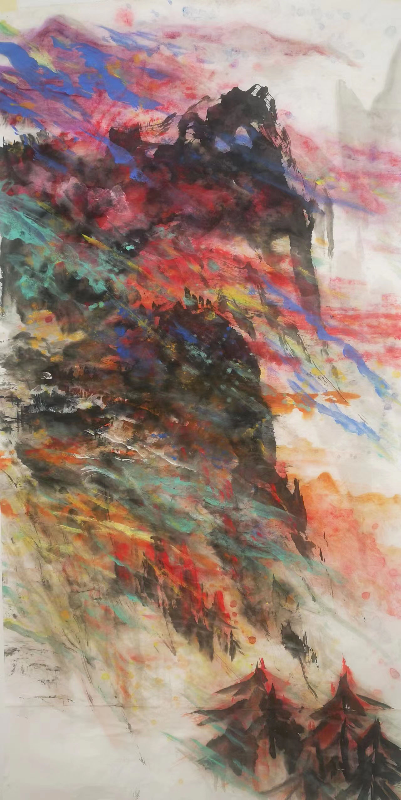 《万峰迎晖图》水墨泼彩/135*70cm/2022年作