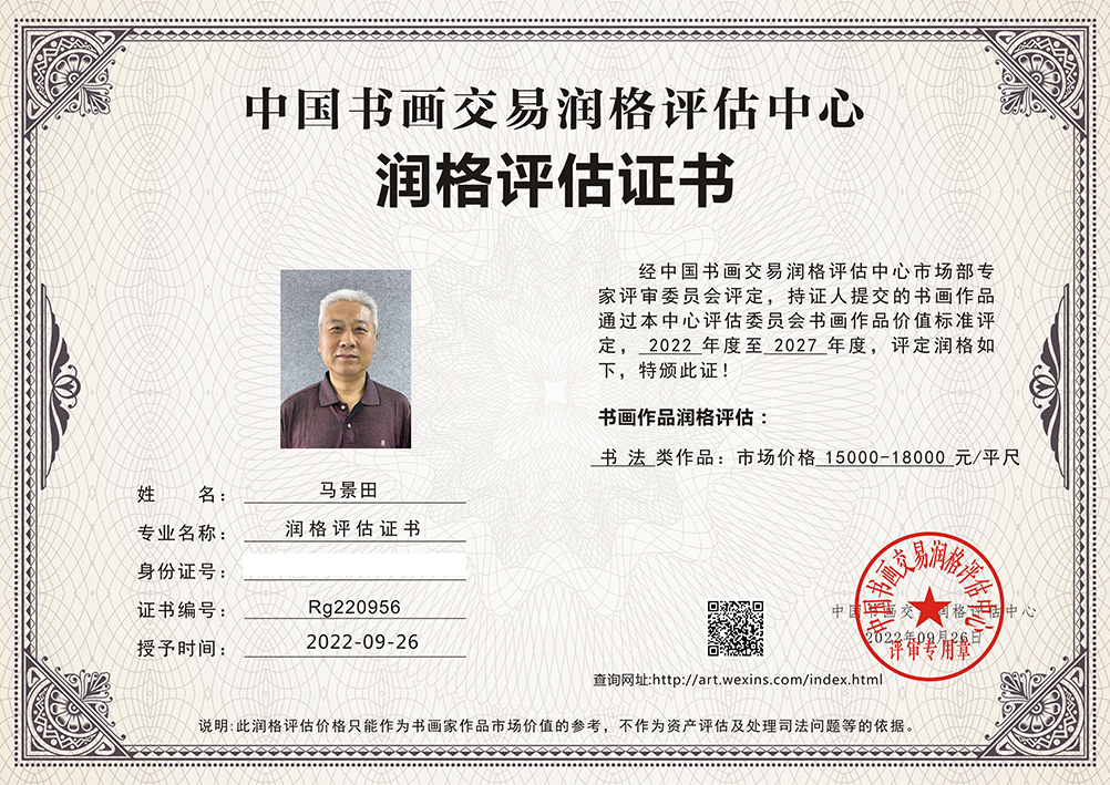 马景田,系中国王羲之书画艺术研究院研究员、中华诗词学会会员、中国老干部书画研究会会员。几十年致力于欧楷、毛体书法的研究与探索,得其真谛与神韵,形成了自己的艺术风格。其作品多次在全国大赛中获奖。由于在中国书画界所取得的丰硕成果和在艺术界的影响力,先后被授予“中国诗文书画家榜样人物”、“中国当代艺术家”、“全国诗书画精英人物”、“高级书画师”等荣誉称号,被聘为“中国诗书画家网名家委员会副主席”,2018年被誉为“德艺双馨”的人民艺术家。