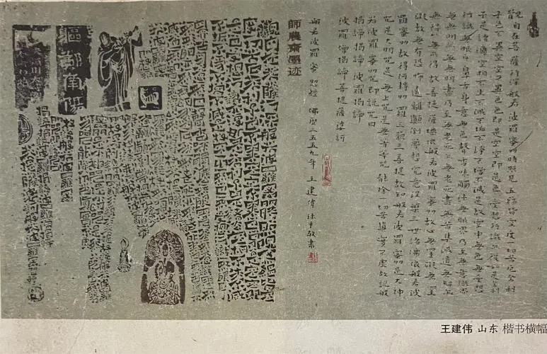 沈鹏赞扬王建伟书法”厚重雄强又飘然灵动”。身为书法家,著名美术评论家,书法国展评审委员会会员,他的的爨宝子书法在我国当今国展之中拔得头筹,以行、草、隶、篆为一体,熔二爨大家书风 爨宝子,爨龙颜,张猛龙历代书法大家之精髓为一炉,形成古朴厚重、雄浑博大、大智大拙的自家书风,在当代书写难度极高的爨宝子书体展现出其雄强而又灵动之风,真正把禅境与个人书法融为一体,完美阐释了生活佛学之大智慧大境界—禅境。