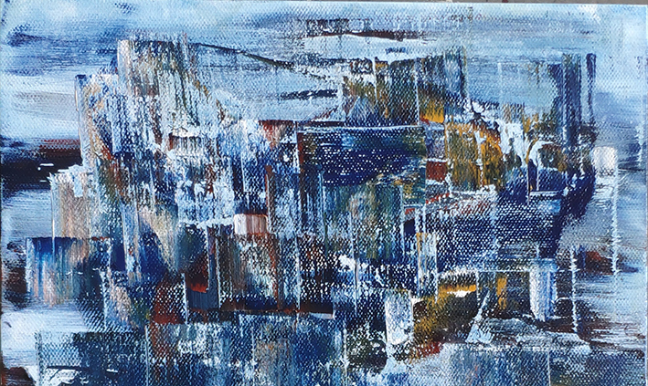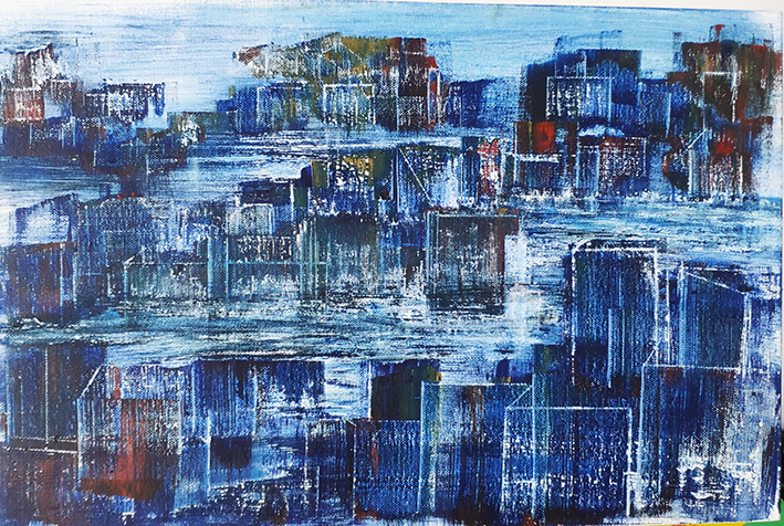 油画:离岸,她把多个影像重叠,像在窗前,望着暮色里的岸边,人们的各自姿态、表情,她本想用一首诗来表达: