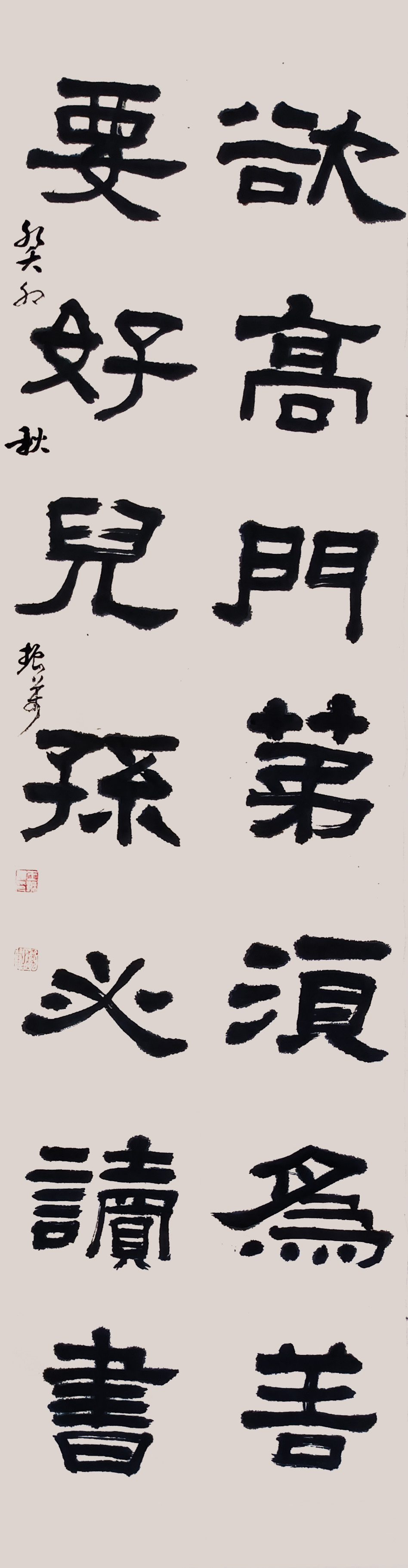 幼承家教,酷爱书法,尤擅汉隶。偶尔写联作诗,挥洒尽性,淋漓尽致。读小学时,班主任曾在其作业批语“字写得可以,要坚持为之”。幼时勤奋好学,见解独到,但因当时社会环境与家庭境况,唯自己任凭兴趣笔耕不辍。为人不拘小节,性格爽朗,张弛有度,师法自然而力求老不迂腐……