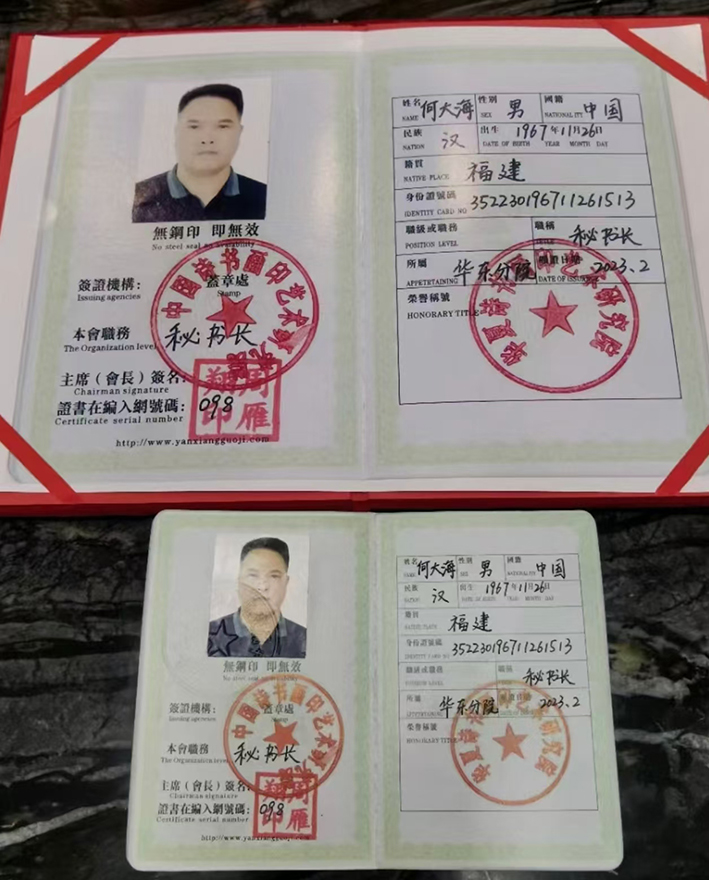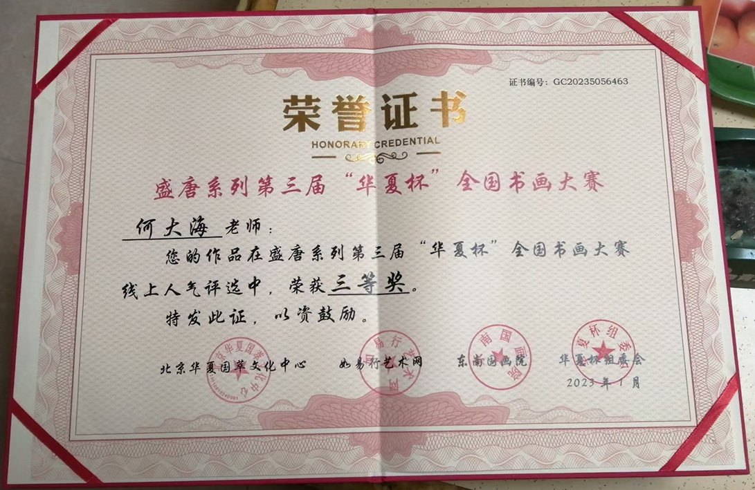 现为中国诗书画印艺术研究院华东分院秘书长,师承著名书画家丁四明先生,著名书画家王宝玺先生第三代弟子。何大海2010年担任彭油湾慈善基金会会长,2011年担任上海木材行业协会家居材料分会会长,何大海在从事各项领域工作中酷爱书法,艺术风格豪放大气,收放自如,2022年在江苏省高邮市书法作品比赛中荣获二等奖,2023年盛唐系列第三届华夏杯全国书画大赛线上人气评选荣获三等奖。